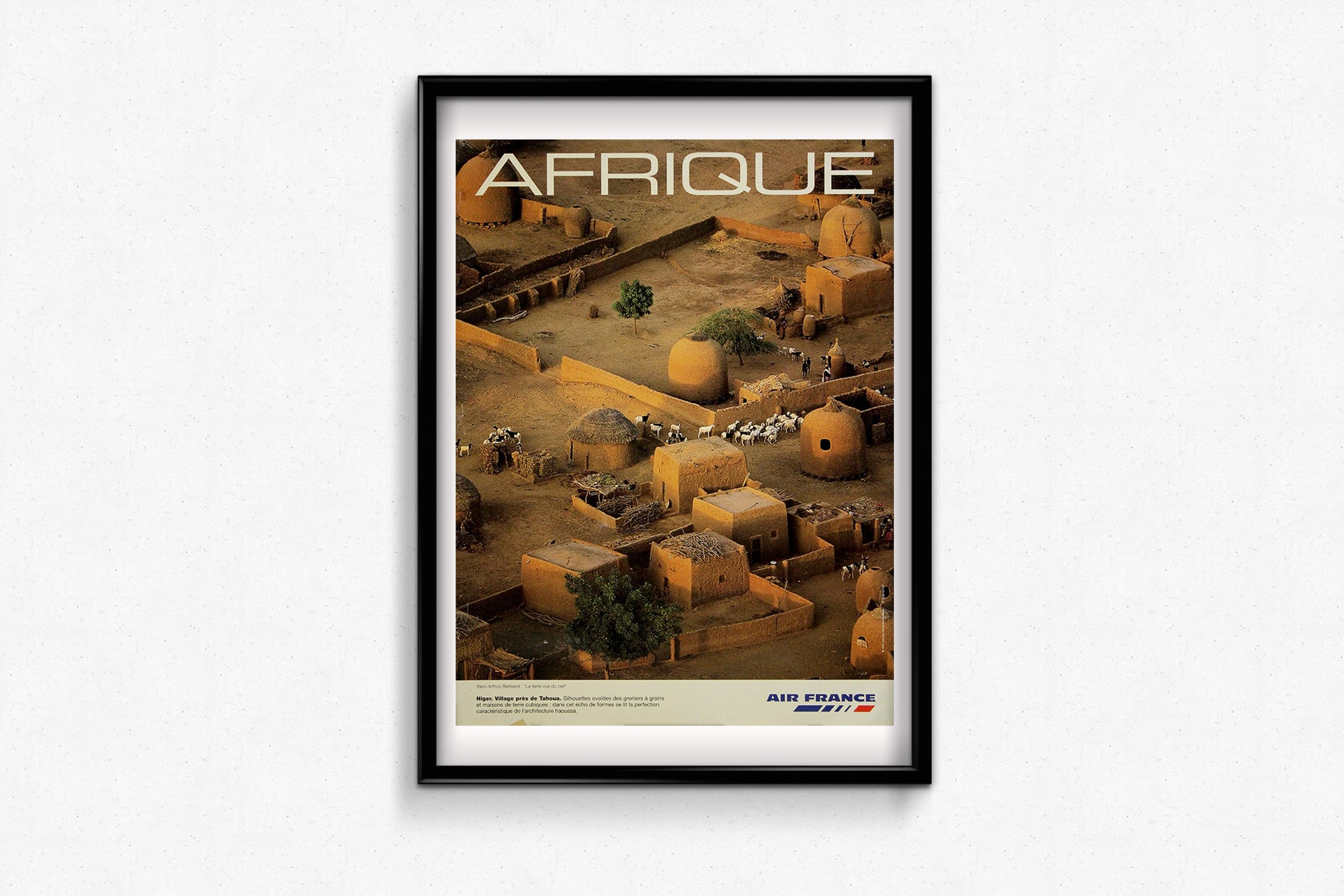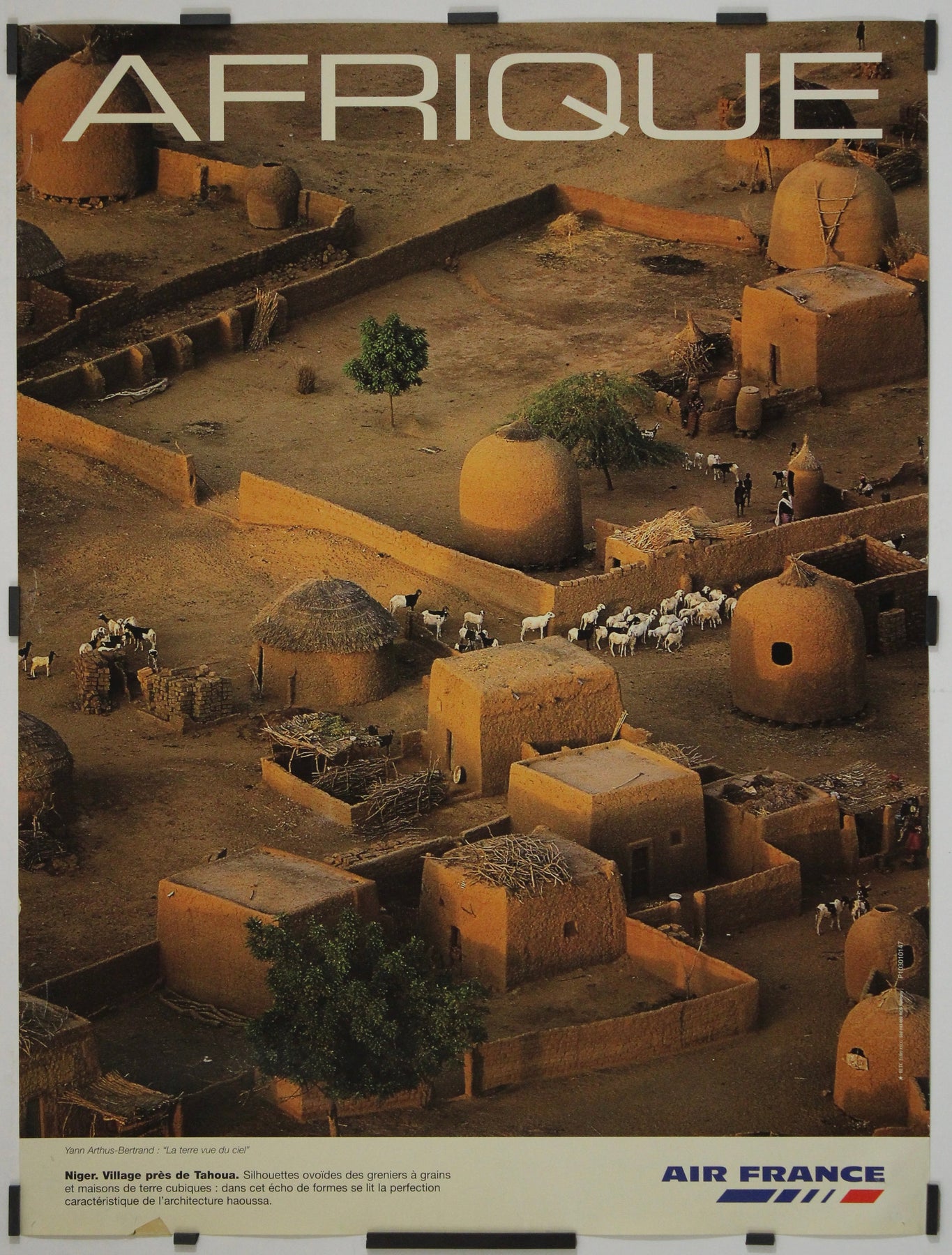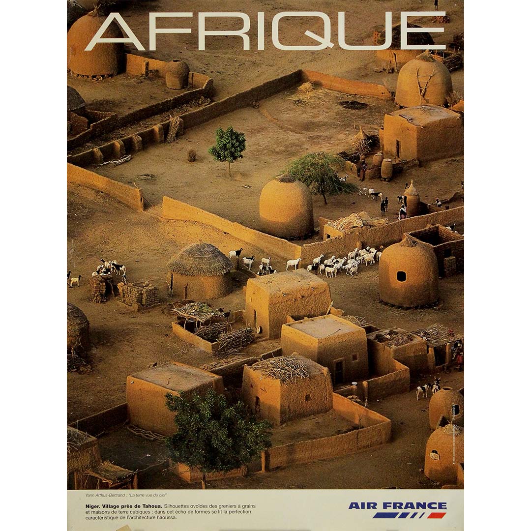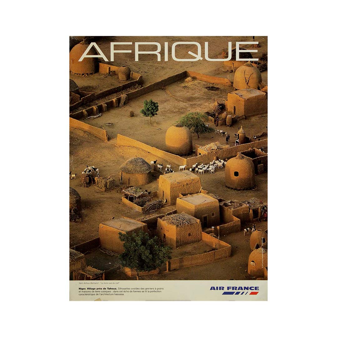 This original circa 2000 Air France poster, captured by the celebrated aerial photographer Yann Arthus-Bertrand, presents a breathtaking view of a traditional Haoussa village near Tahoua, in Niger. Issued during a time when the airline was actively promoting global cultural awareness and ecological beauty, the image forms part of Arthus-Bertrand’s broader environmental and geographical oeuvre.