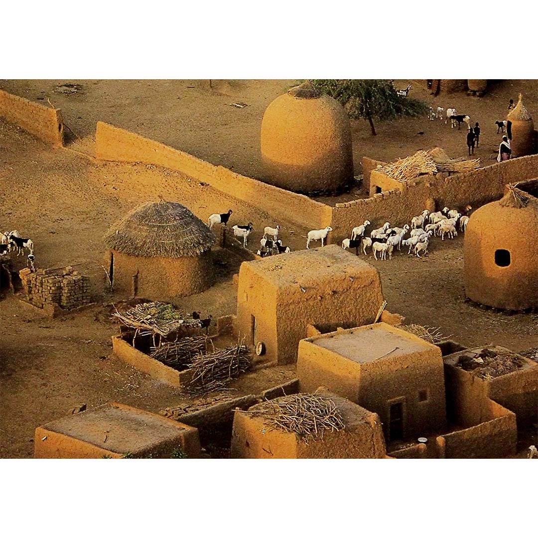 Seen from above, the village is a harmonious patchwork of sunbaked ochre dwellings, domed granaries, and animal enclosures, all crafted in earth-toned hues that blend seamlessly into the surrounding Sahel landscape. A few patches of vibrant green trees punctuate the arid terrain, while goats and cattle meander through narrow passageways—life in motion, captured in stillness.