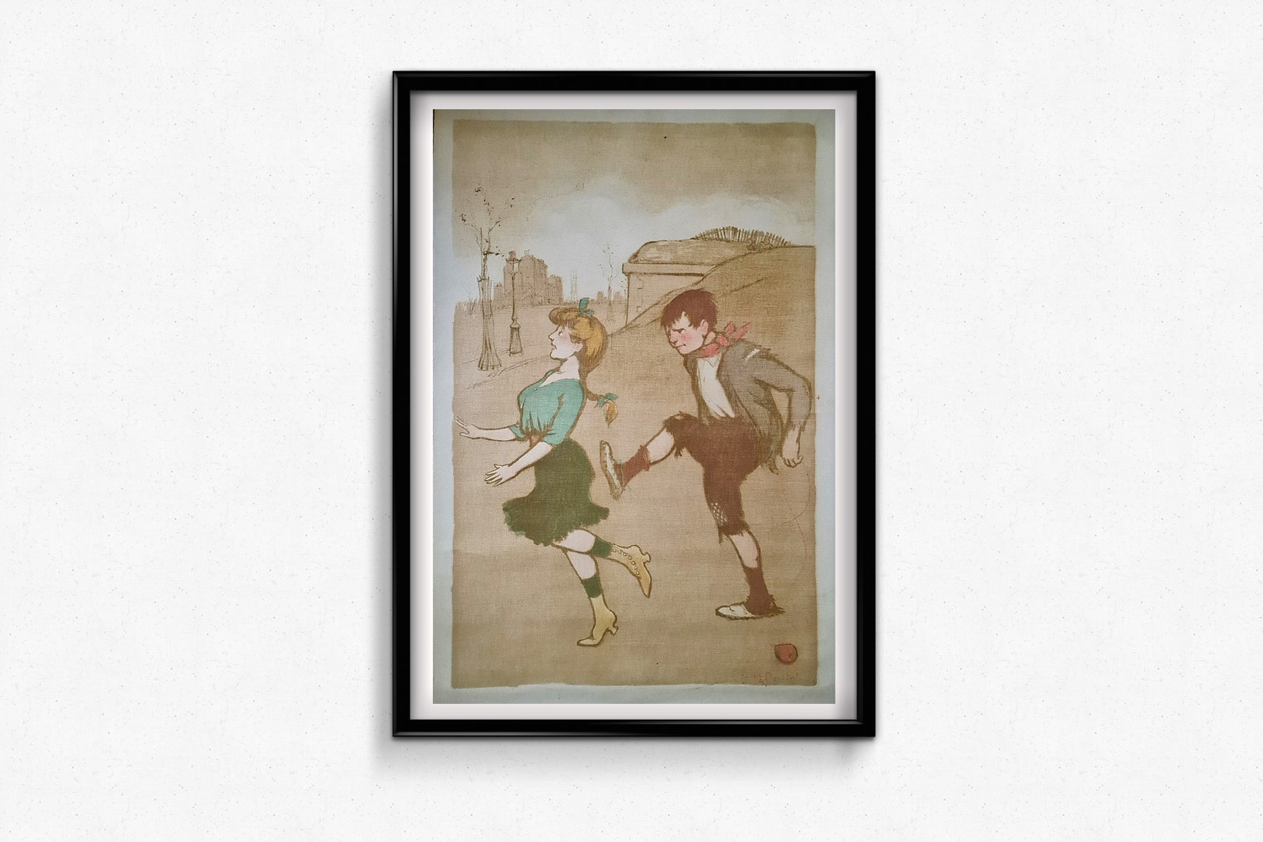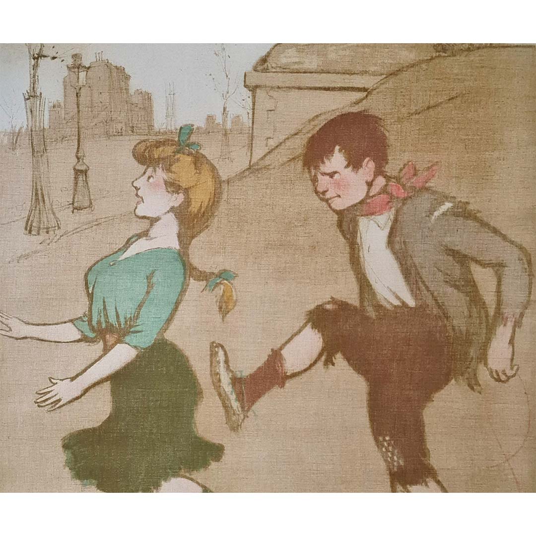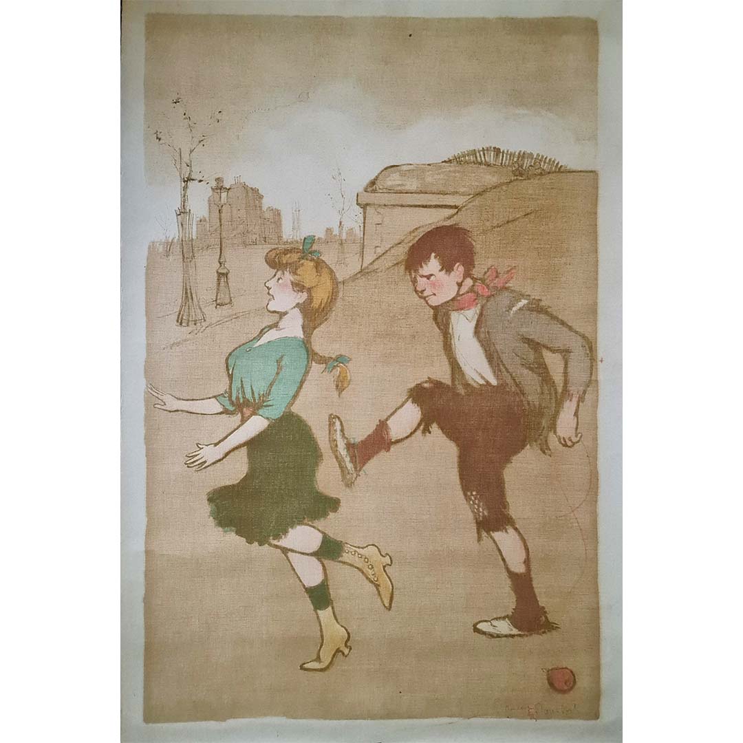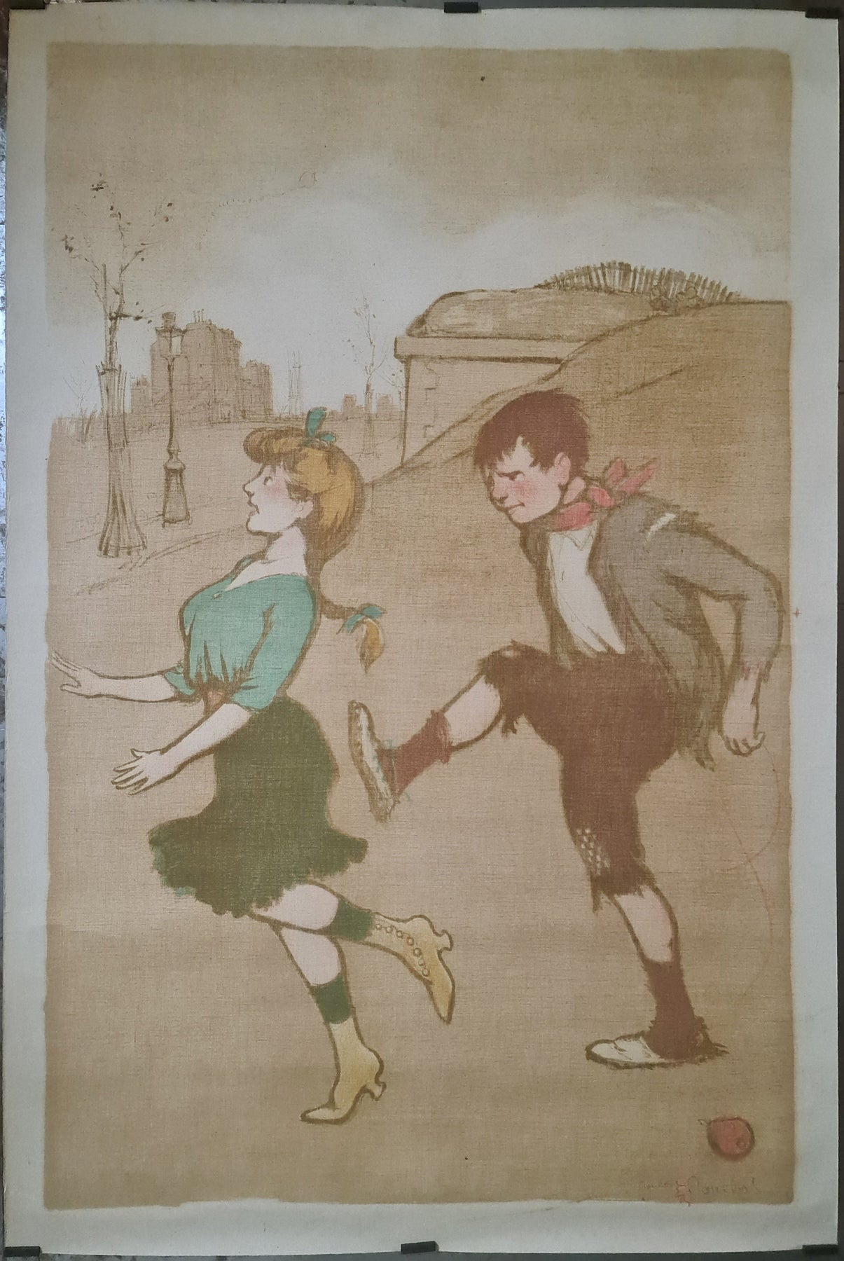 Poulbot, known for his poignant and humorous depictions of Parisian street children, delivers here a scene filled with humor and vitality. A young ragamuffin boy, dressed in patched clothes and scuffed shoes, performs an exaggerated kick behind an oblivious or perhaps equally cheeky girl, who struts ahead with confident flair and exaggerated elegance. Their exaggerated postures and expressive faces recall the comédie humaine of the Belle Époque’s street life, filtered through the artist’s tender and satirical eye.