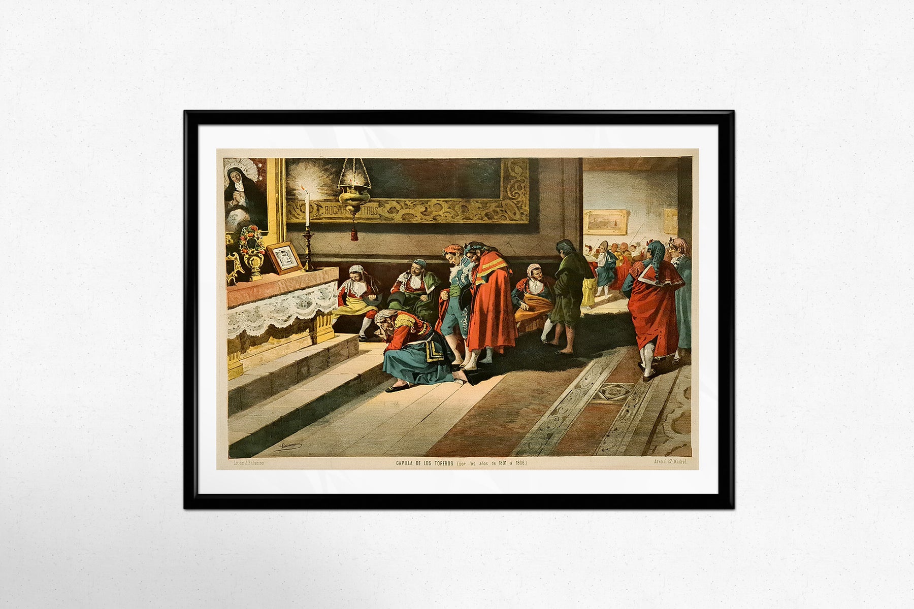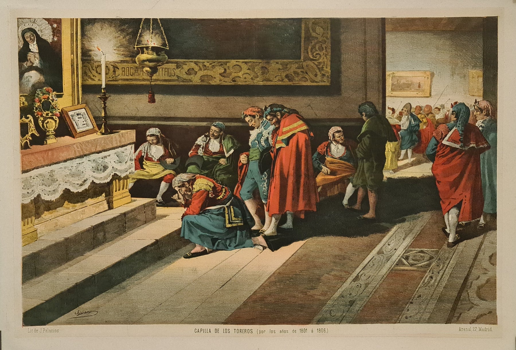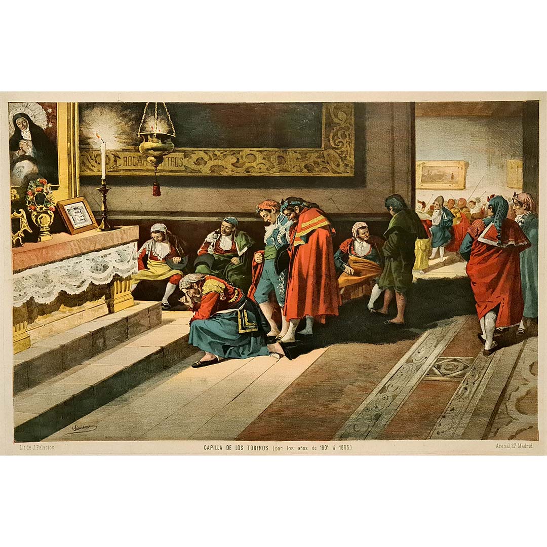 This richly detailed chromolithograph by Ángel Lizcano takes us into the solemn and intimate world of Spanish bullfighters, pausing for prayer in the "Capilla de los Toreros"—the bullfighters’ chapel—sometime between 1801 and 1806.