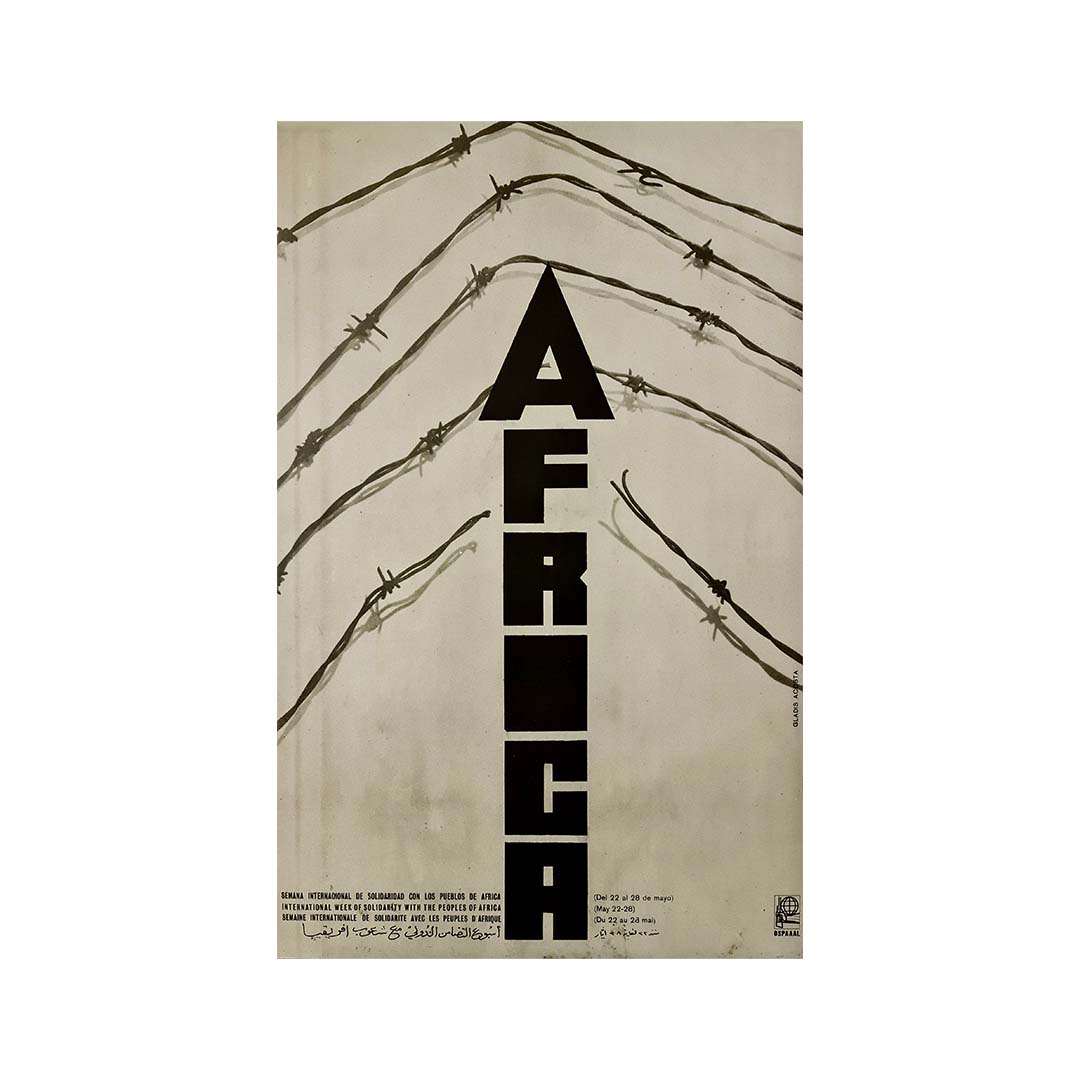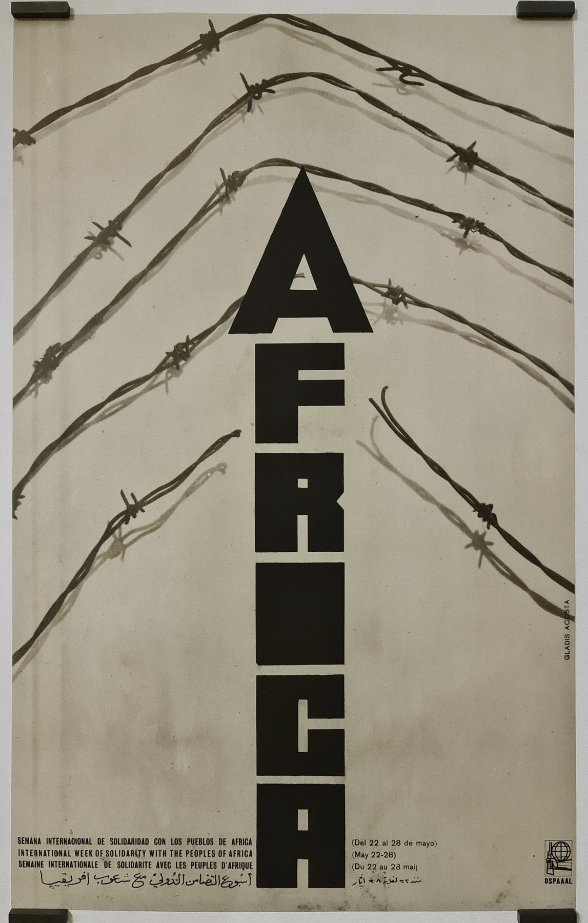 Stark, raw, and uncompromising, this original circa 1970 OSPAAAL poster by Gladis Acosta encapsulates the brutal realities of colonial oppression in Africa with piercing graphic clarity. Issued for the International Week of Solidarity with the Peoples of Africa (May 22–28), the poster's design merges typographic force and minimalist symbolism in a powerful call to global conscience.