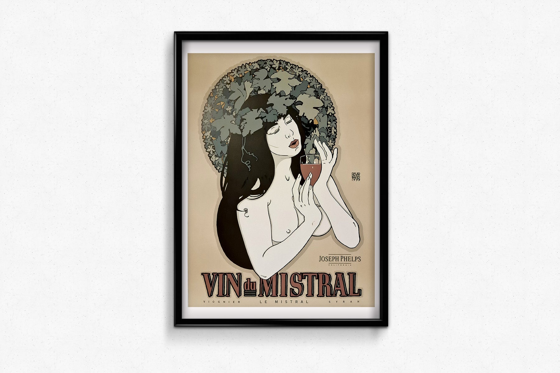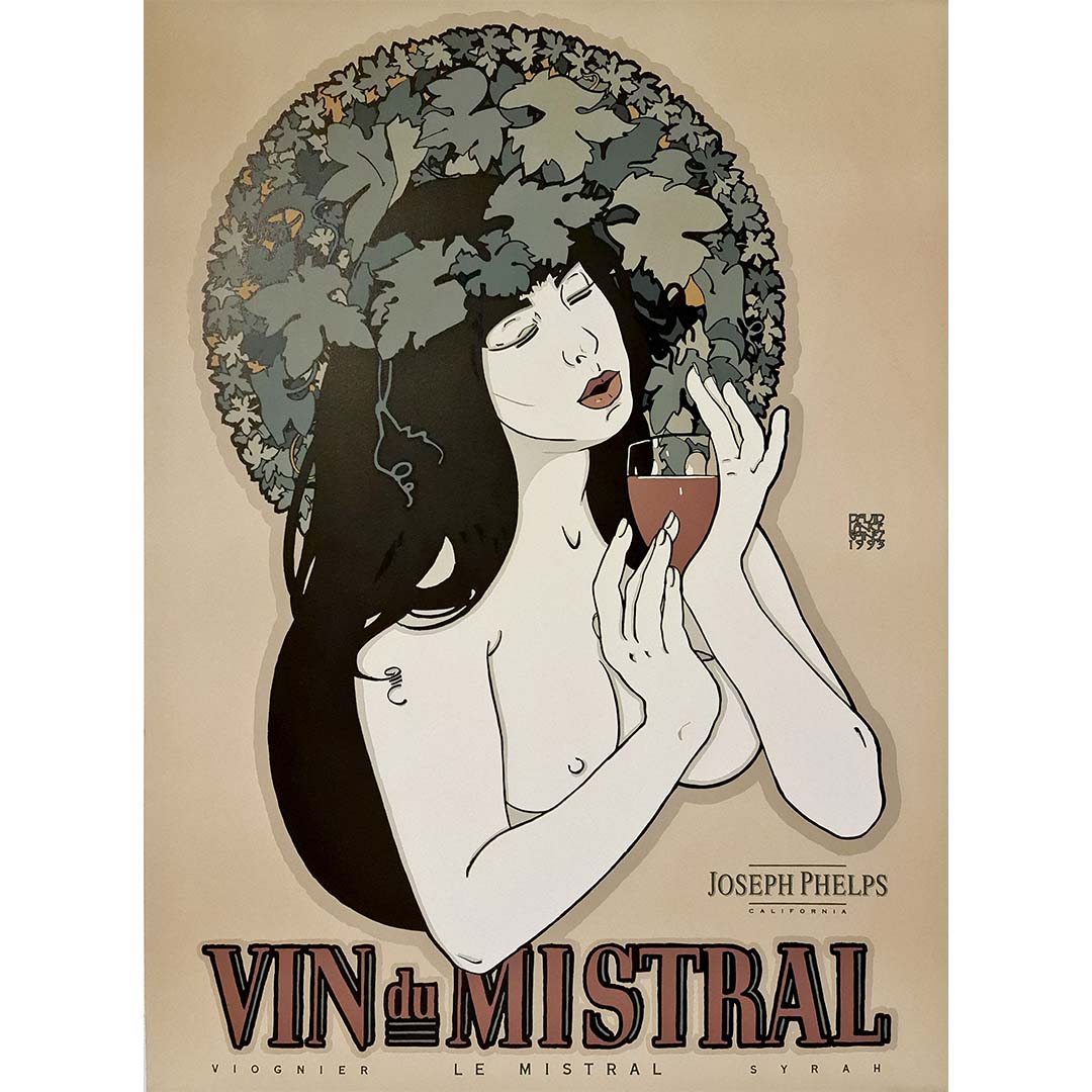 Beneath her, the bold lettering “VIN du MISTRAL” anchors the composition with a stylized typographic elegance that perfectly complements the soft, earthy palette of beiges, muted greens, and deep reds. Created for the 1993 vintage of Le Mistral, a Rhône-style blend from California’s Central Coast, the poster subtly evokes Old World sophistication with New World freshness. The wine — a blend often including Syrah, Viognier, and other Rhône varietals — takes its name from the Mistral wind that sweeps across Southern France, and the poster echoes that elemental spirit.