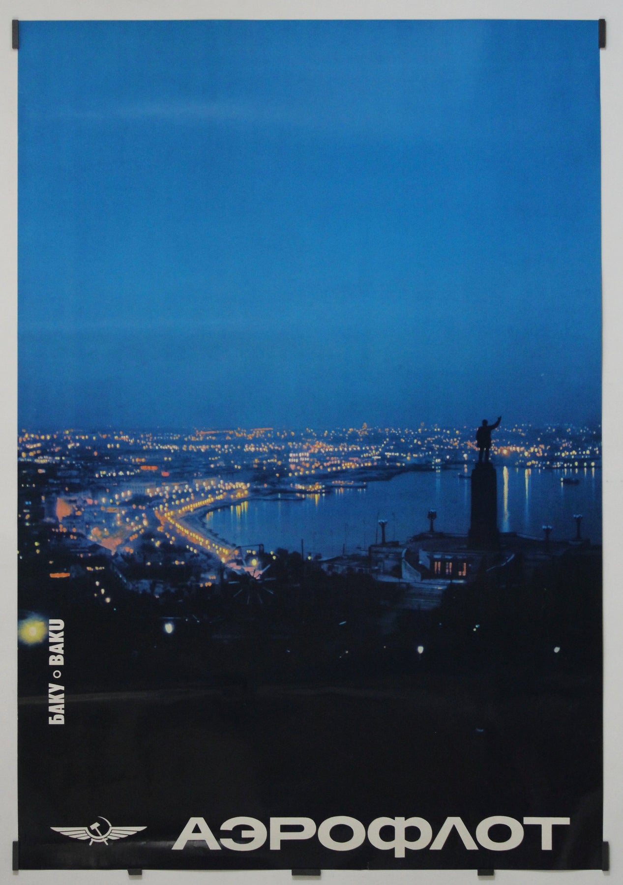 Set against this majestic nighttime panorama, the Cyrillic and Latin “Baku” inscriptions on the side and the iconic Aeroflot logo along the bottom ground the poster firmly in its purpose: to entice foreign and domestic passengers alike to explore the USSR’s diverse republics via the comfort and reach of Aeroflot’s global fleet.