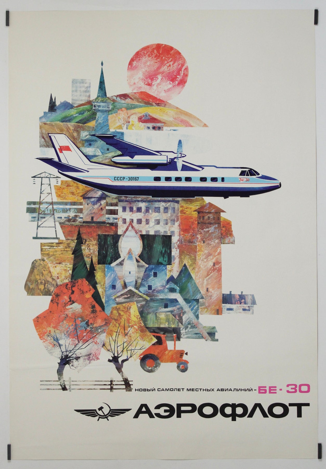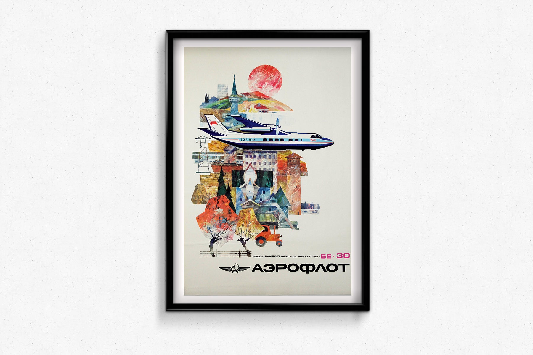 This striking original vintage Aeroflot poster showcases the Soviet Union’s BE-30 regional aircraft, a short-haul airliner designed to connect remote areas across the vast USSR with efficiency and speed.