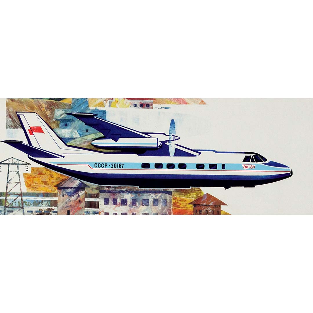 The BE-30, developed in the late 1960s, was built for local air routes, bringing access to small towns and industrial regions. The poster promotes it as a “New aircraft for regional airlines”, reinforcing the USSR’s commitment to modern infrastructure and national unity through connected skies.