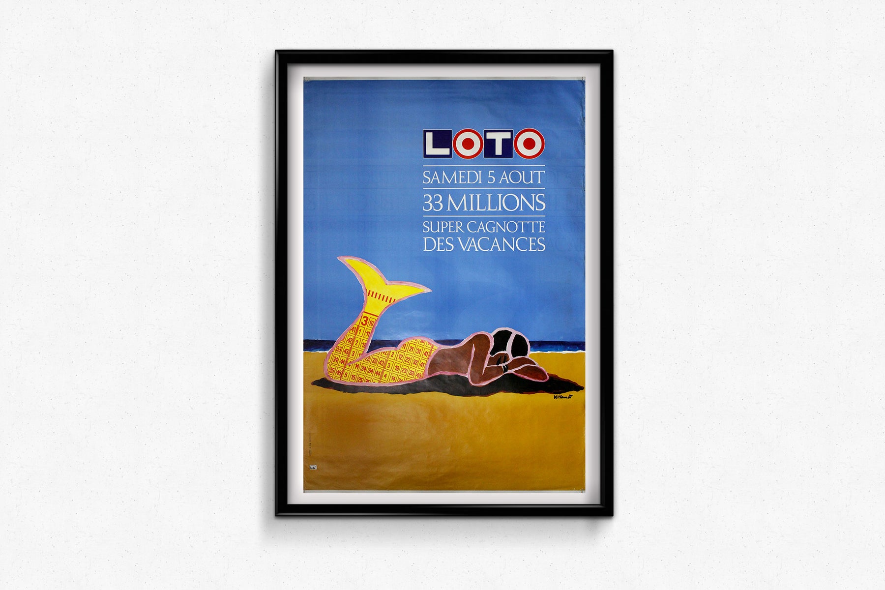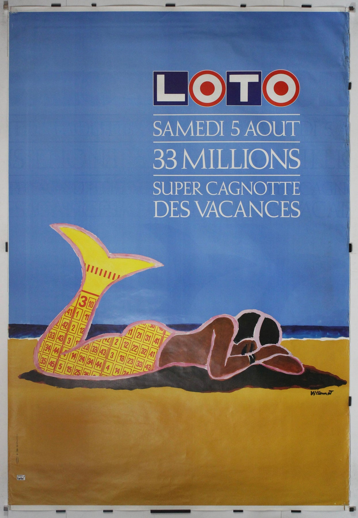 In typical Villemot fashion, the design is bold, minimal, and instantly eye-catching. A playful mermaid figure—sunbathing on a beach—takes center stage. Her golden tail is composed of lottery ticket numbers, visually connecting the fantasy of a mythical creature with the dream of winning big. The bright yellow-orange tones of the sand contrast sharply with the tranquil blue of the sea and sky, enhancing the summery, escapist feel of the composition.