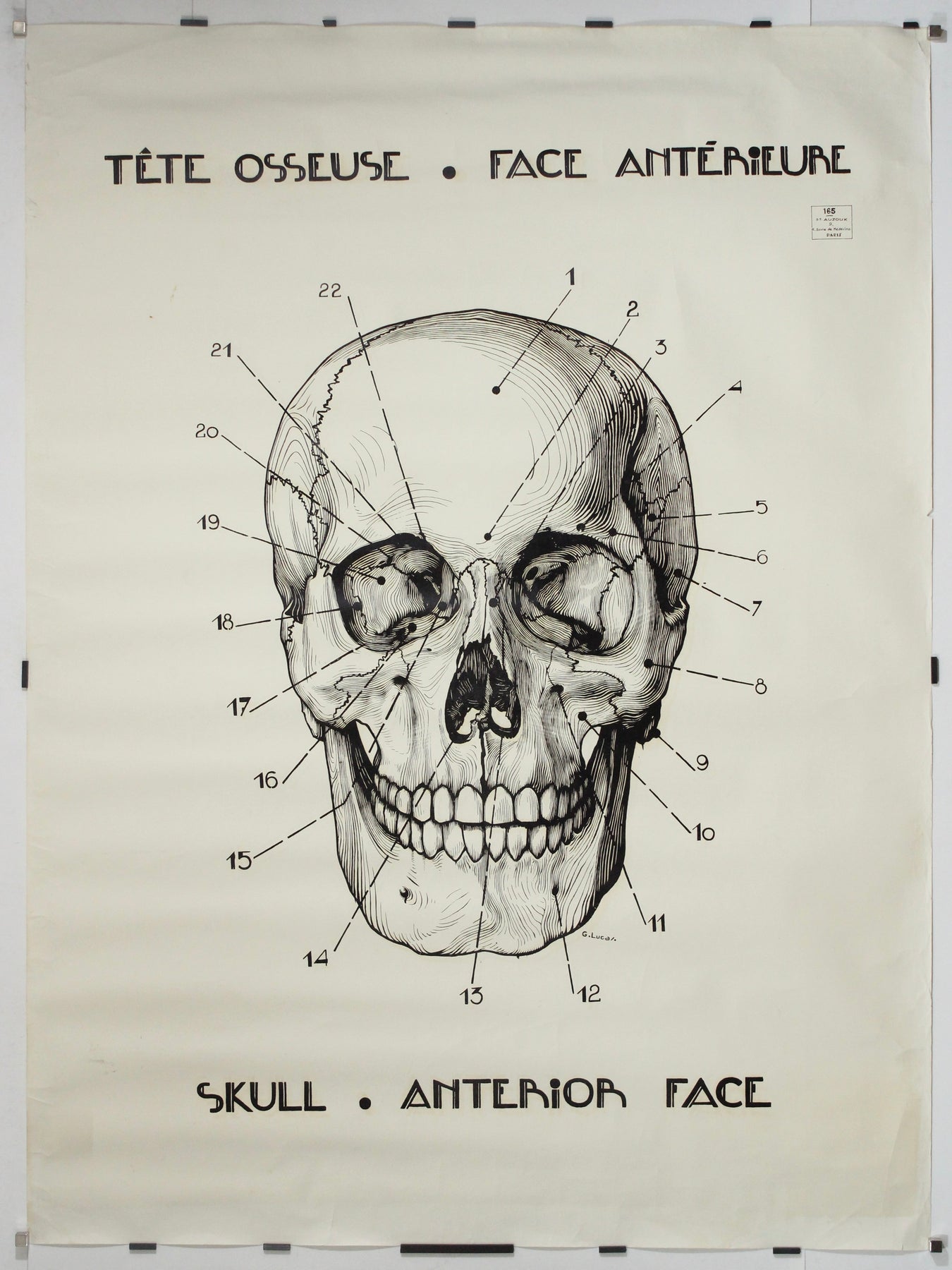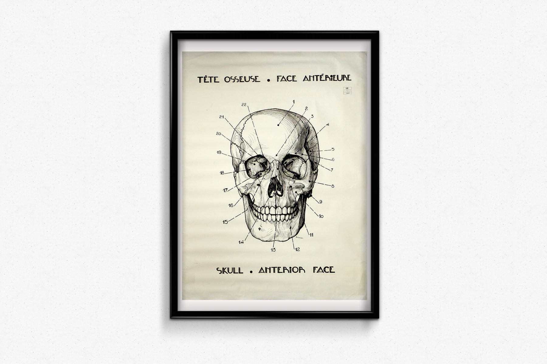 This original circa 1950 French anatomical poster, titled Tête osseuse – Face antérieure (Skull – Anterior Face), was created by G. Lucas for educational use and is based on the work of the legendary anatomist Dr. Louis Auzoux.