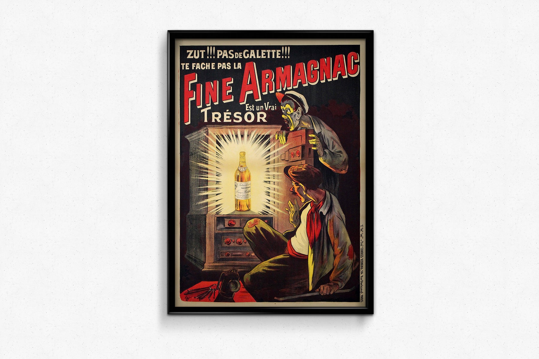 This delightful 1902 original poster by the celebrated French illustrator Eugène Ogé promotes Fine Armagnac with wit, theatrical flair, and unmistakable Belle Époque charm. The scene depicts two startled burglars who, having broken into a safe in search of cash (“galette”), discover instead a bottle of Armagnac glowing like a precious jewel. The humorous slogan reinforces the message: even if there is no money, this Fine Armagnac is “a true treasure.” Ogé transforms a simple advertising message into a miniature comic narrative, using exaggerated expressions, dramatic lighting, and bold composition to capture attention instantly.