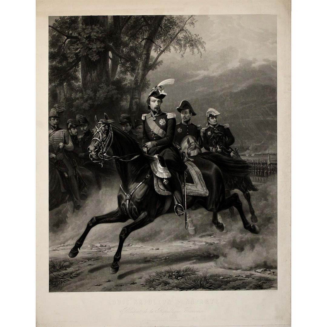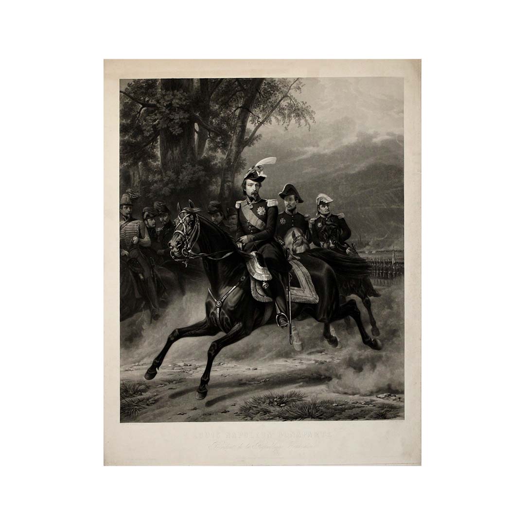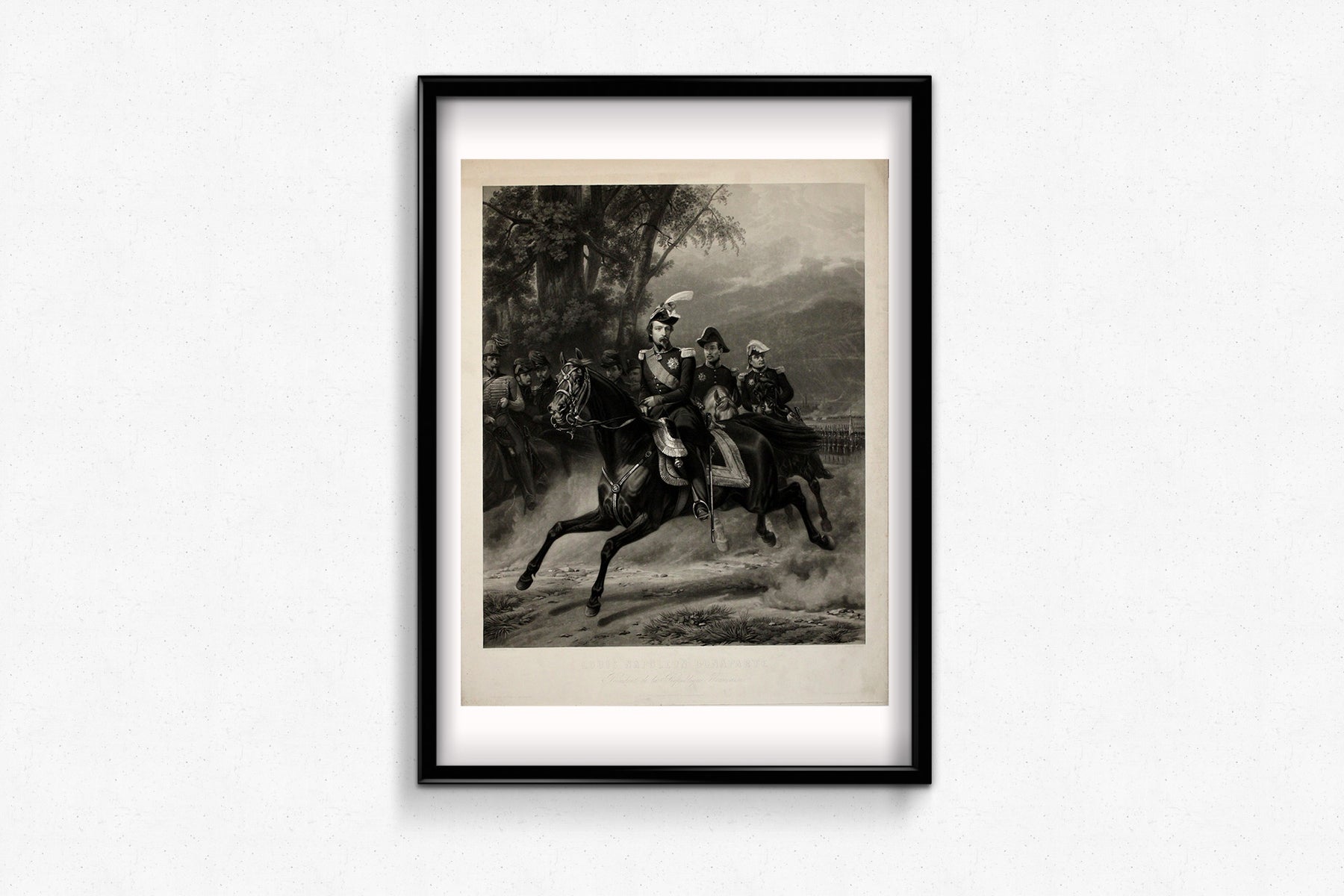 Cette gravure du XIXe siècle, d'après Horace Vernet, présente un portrait équestre monumental de Louis-Napoléon Bonaparte à un moment décisif de l'histoire de France. Réalisée en 1851, année de son coup d'État et à la veille de sa proclamation comme empereur Napoléon III, l'image fonctionne non seulement comme un portrait, mais aussi comme une affirmation soigneusement construite du pouvoir, de la légitimité et du destin.