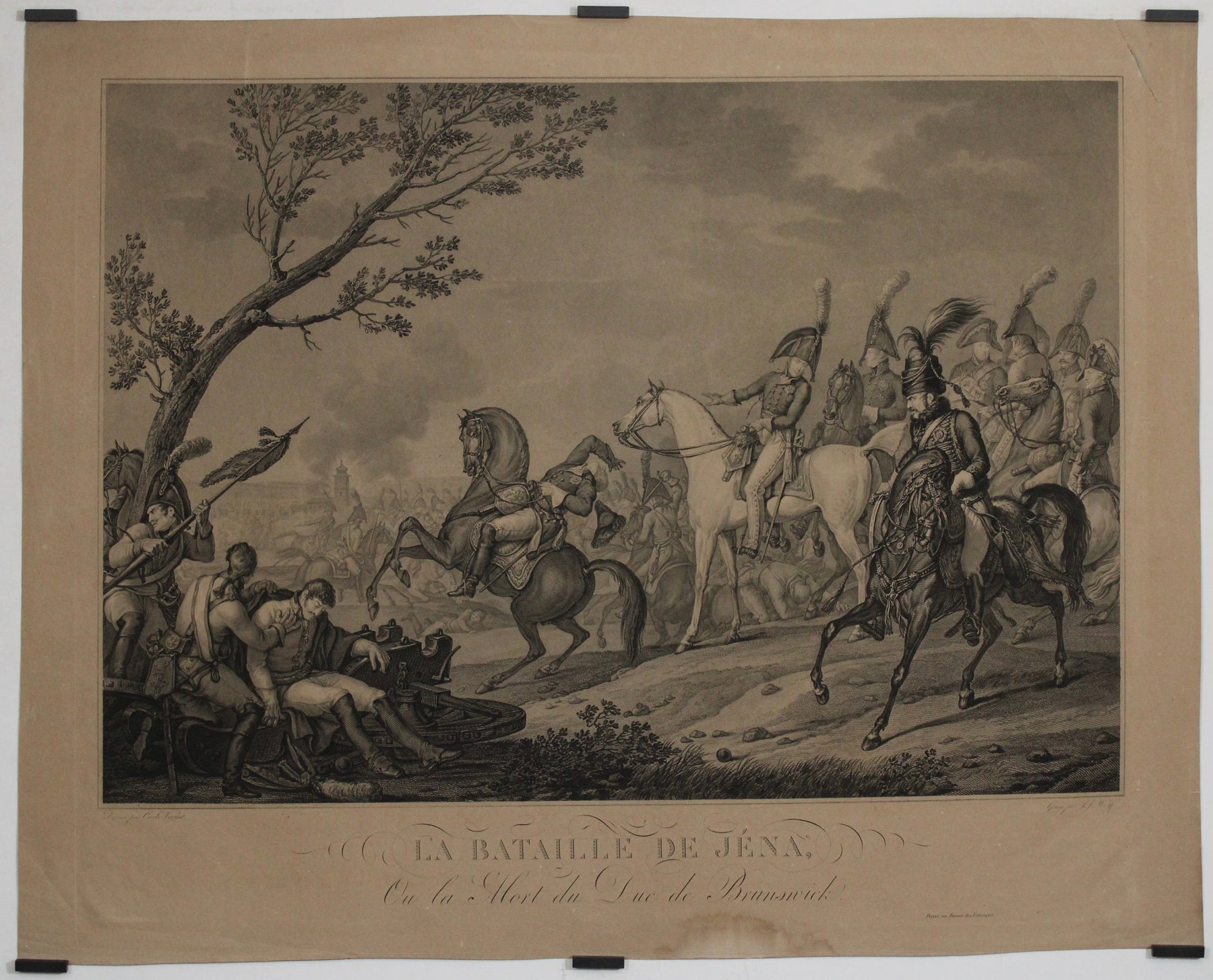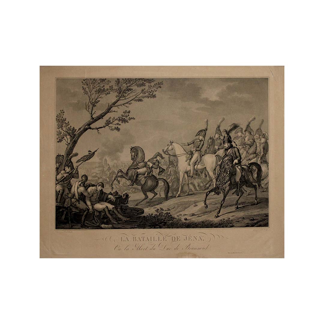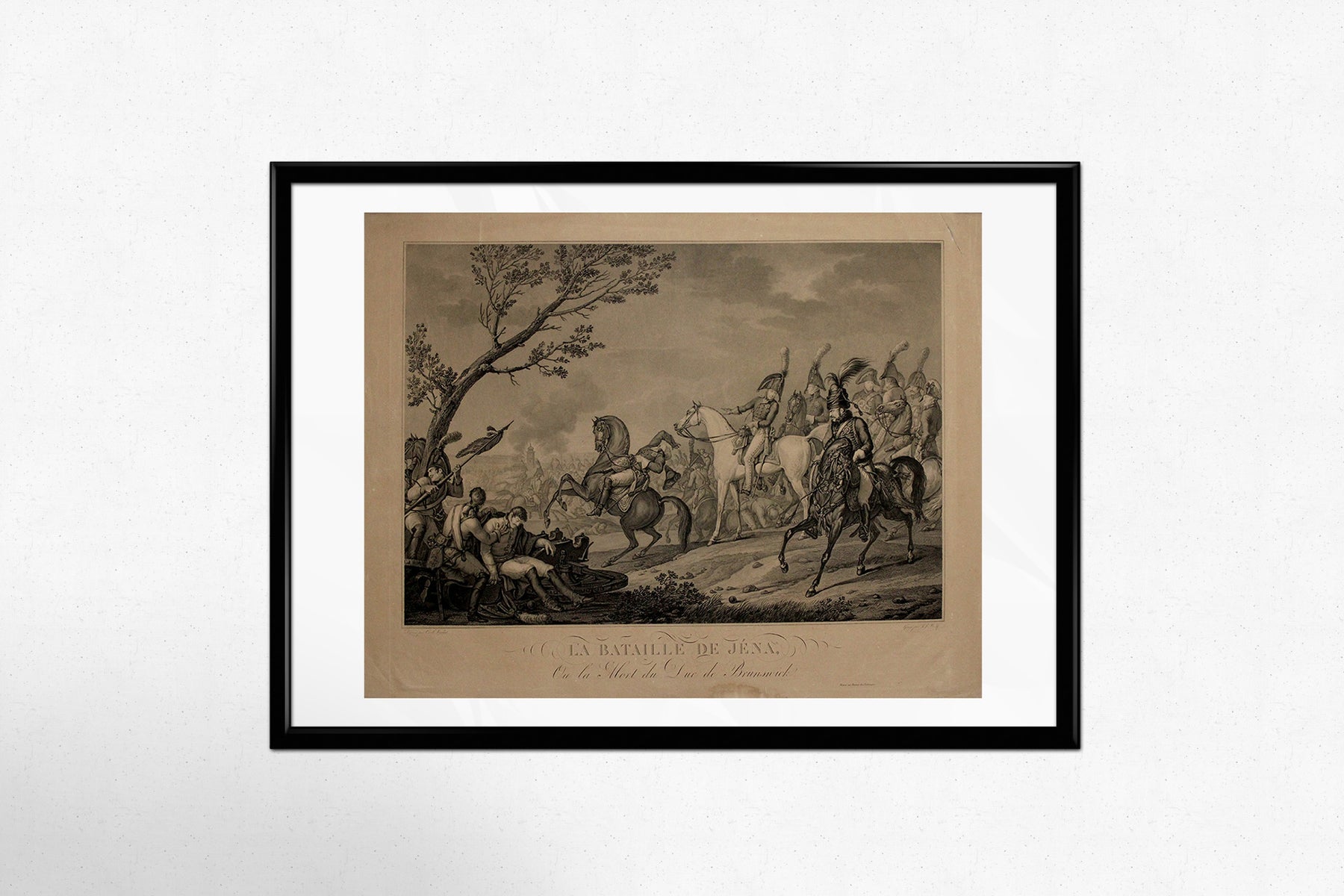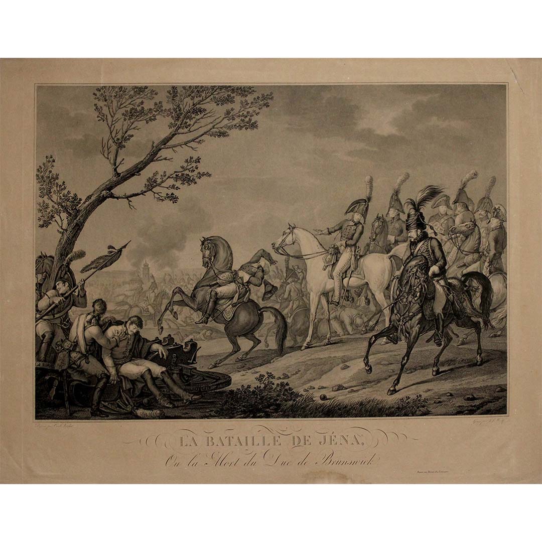 Cette puissante gravure du XIXe siècle, signée Carle Vernet, représente l'un des épisodes les plus décisifs des guerres napoléoniennes : la bataille d'Iéna (1806), où l'armée de Napoléon écrasa les forces prussiennes et bouleversa l'ordre militaire européen. La scène met en lumière le moment dramatique traditionnellement associé à la blessure mortelle du duc de Brunswick, commandant en chef de l'armée prussienne, qui succombera peu après à ses blessures reçues durant la campagne.