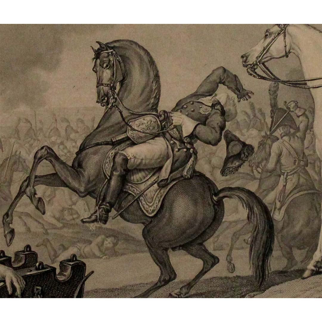 Stylistiquement, la gravure s'inscrit dans la grande tradition française de l'iconographie historique des batailles, mêlant ambition documentaire et mise en scène théâtrale. Vernet, réputé pour ses scènes équestres et ses sujets militaires, apporte une précision exceptionnelle aux uniformes, harnais et armes, tout en insufflant aux personnages une tension dramatique palpable. Chevaux cabrés, soldats gesticulent, nuages tourbillonnent au-dessus de leurs têtes, créant un rythme visuel qui accentue le sentiment d'immédiateté et de chaos.
