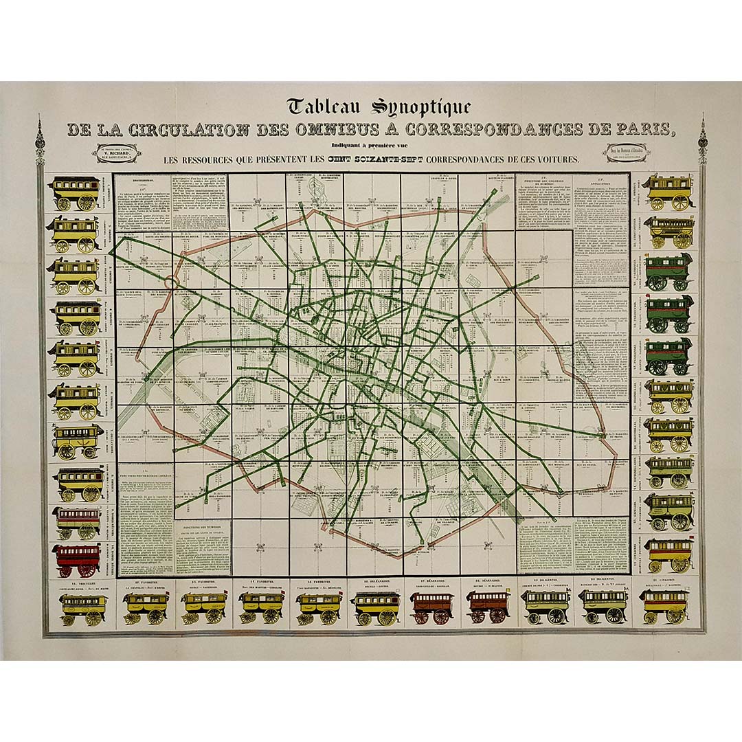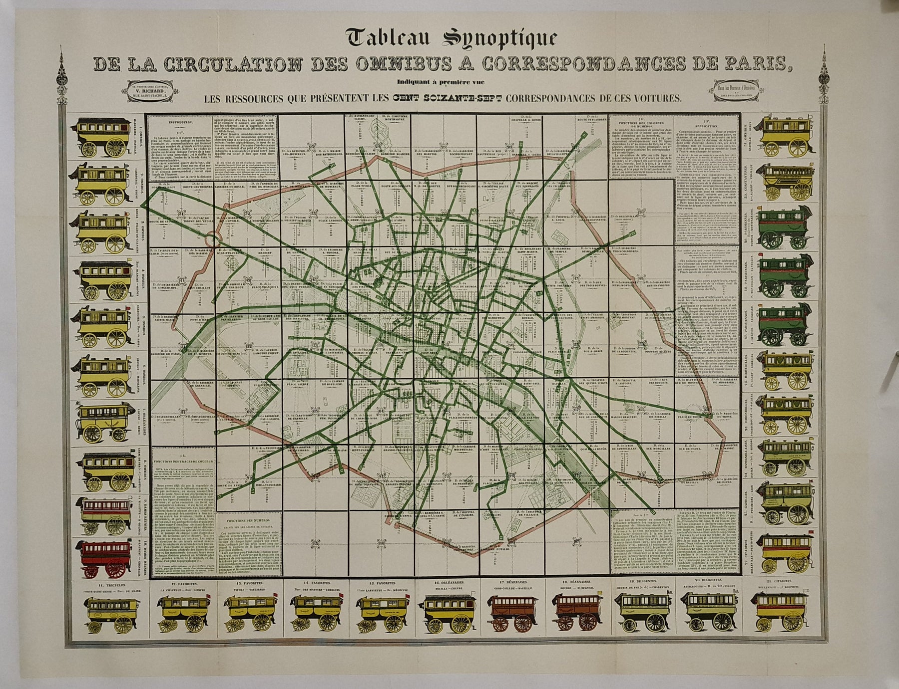 This remarkable original poster offers a snapshot of the Parisian public transportation system before 1854, capturing the intricate network of horse-drawn omnibuses that circulated throughout the capital. Titled “Tableau synoptique de la circulation des omnibus à correspondances de Paris,” it is one of the earliest known attempts to visually organize and standardize the routes of public vehicles within the rapidly expanding urban landscape of Haussmann-era Paris.