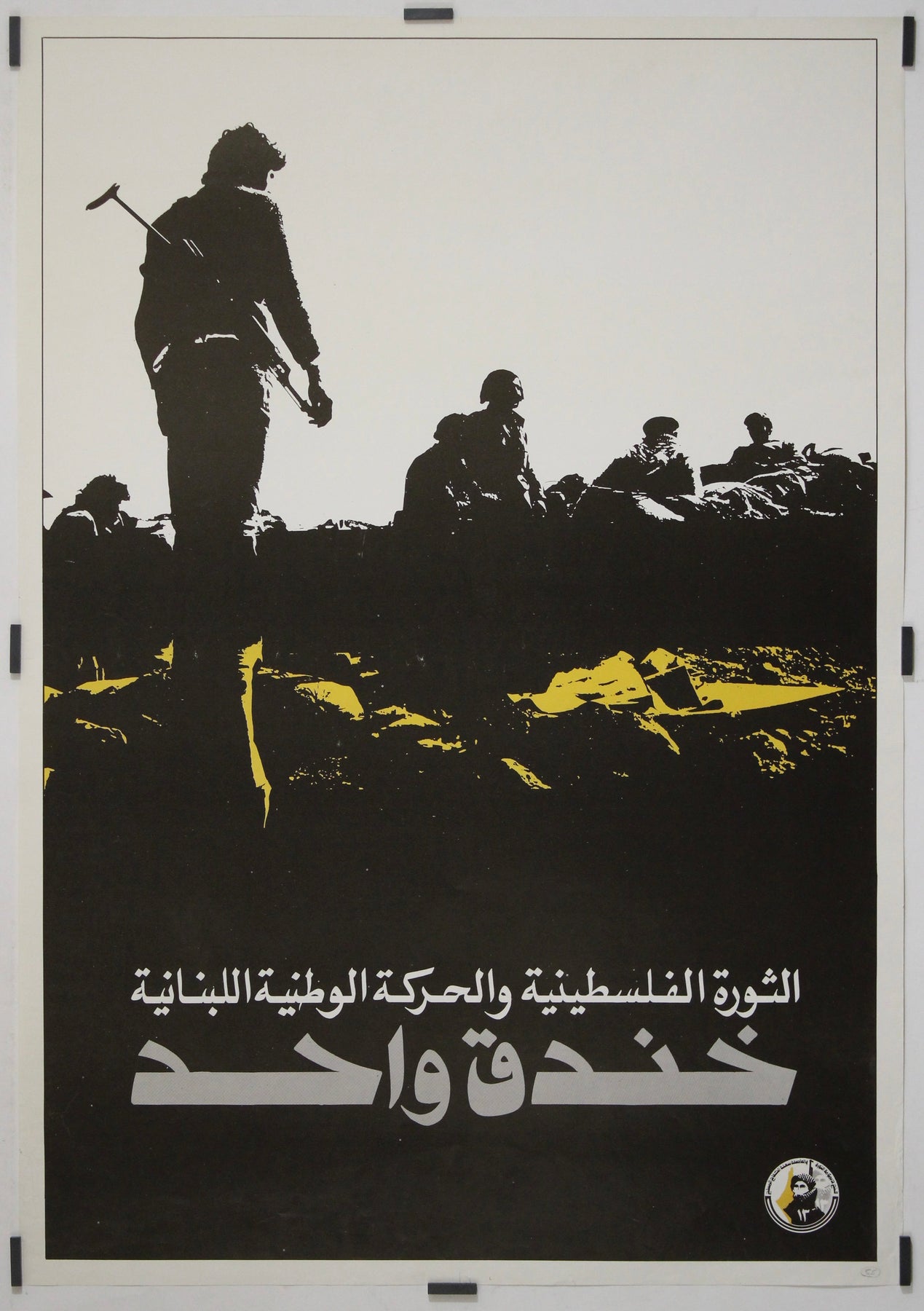 L'inscription arabe se traduit plus précisément par « La révolution palestinienne et le Mouvement national libanais ne font qu'un ». Ce slogan exprime la solidarité entre les organisations palestiniennes et les factions nationalistes libanaises, un sentiment particulièrement pertinent durant la période précédant la guerre civile libanaise (1975-1990). Bien qu'aucune date de publication précise ne figure sur l'affiche, son style graphique, sa typographie et son message politique suggèrent fortement une production au début des années 1970.