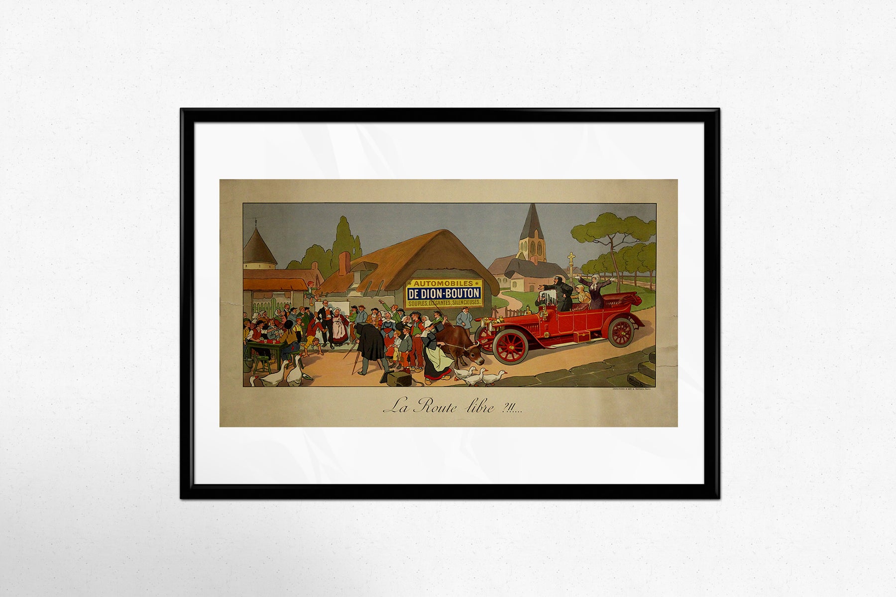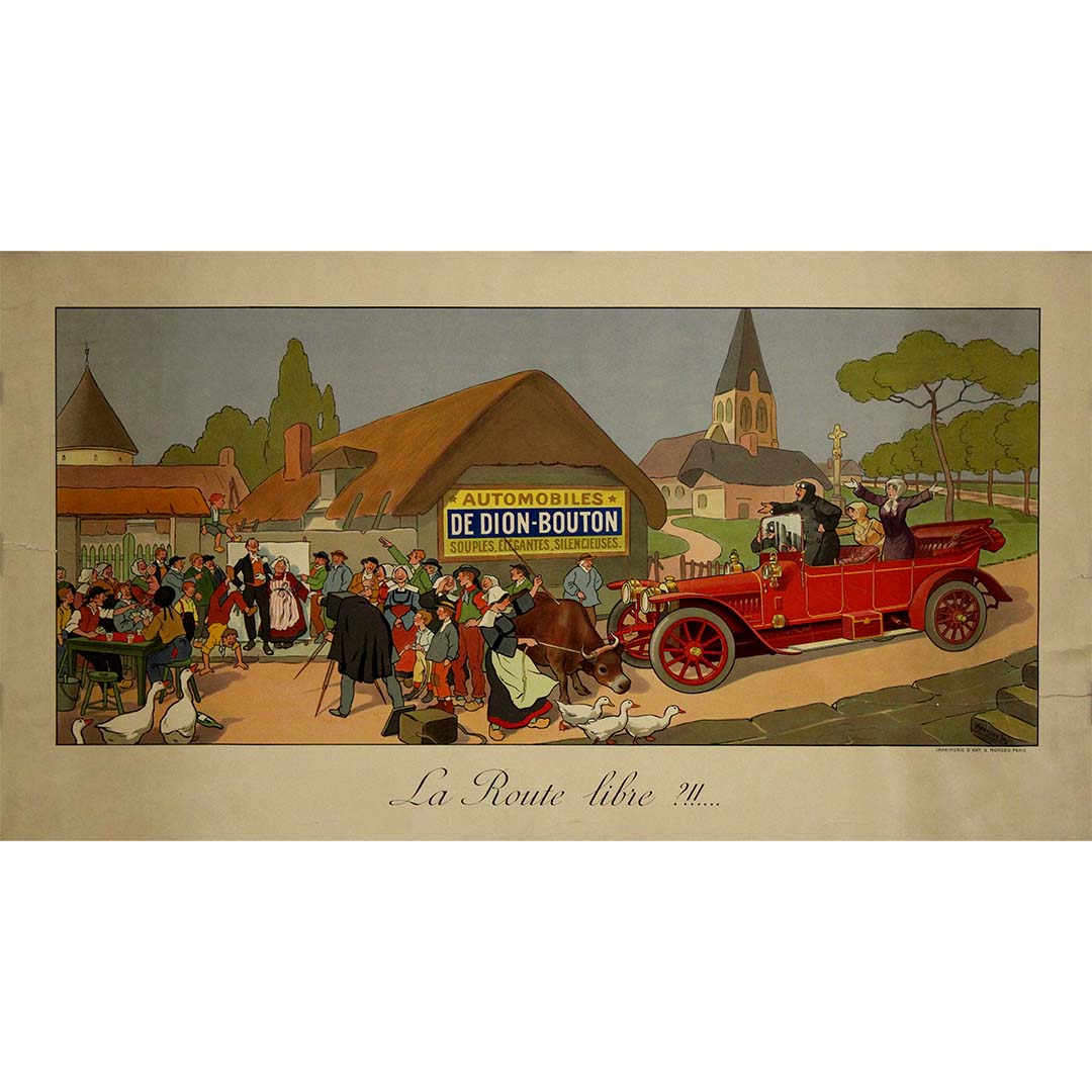Cette affiche publicitaire originale de Mourgue , datant d'environ 1900, a été créée pour promouvoir les automobiles pionnières de De Dion-Bouton , l'une des marques les plus influentes des débuts de l'automobile. Intitulée « La route libre ?!!… » , l'affiche illustre avec humour le choc culturel provoqué par l'arrivée de l'automobile dans la France rurale au tournant du XXe siècle.