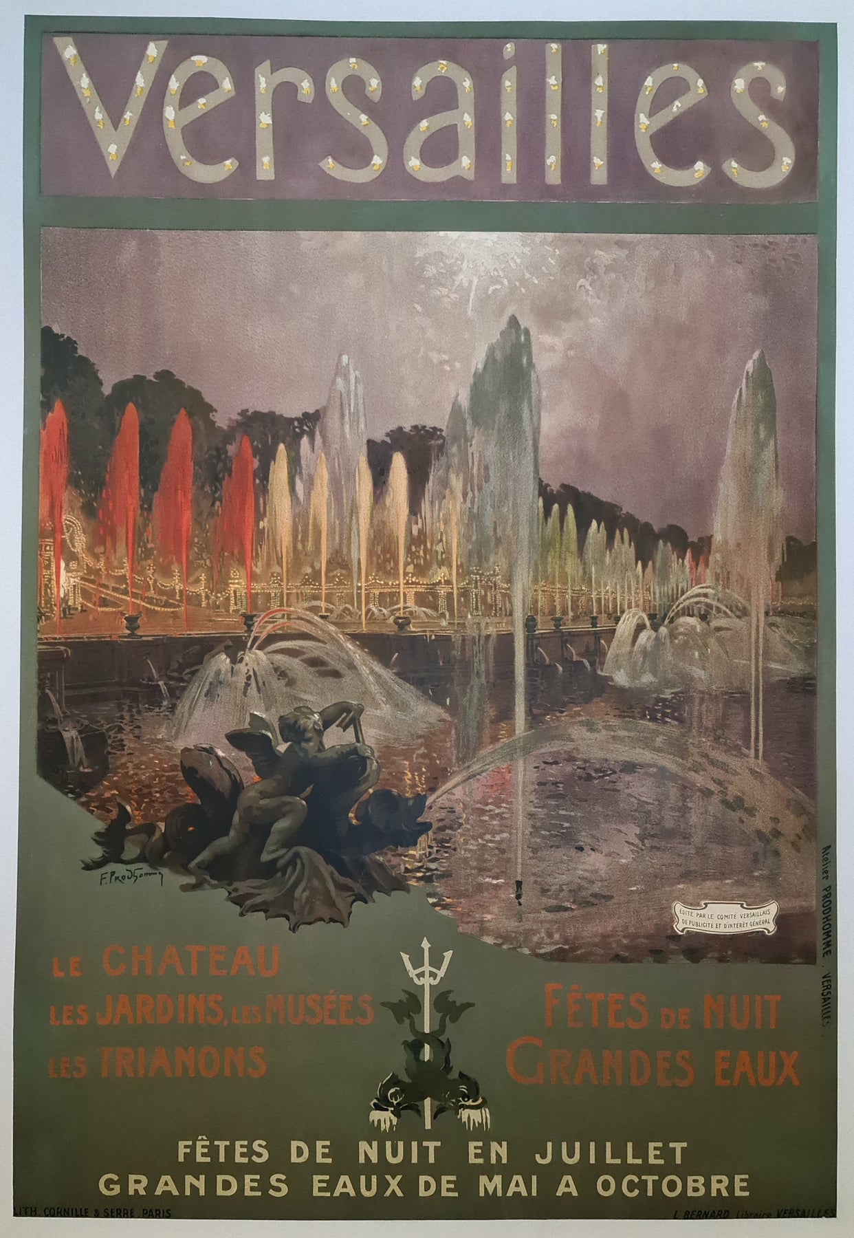 This elegant original poster captures the magic and grandeur of the famous Grandes Eaux Nocturnes at the Château de Versailles—an enchanting nighttime spectacle where water, light, and music bring the palace gardens to life. Created around 1920 by French artist F. Prodhomme, the poster is both a celebration of classical French culture and a stunning example of early 20th-century travel advertising.