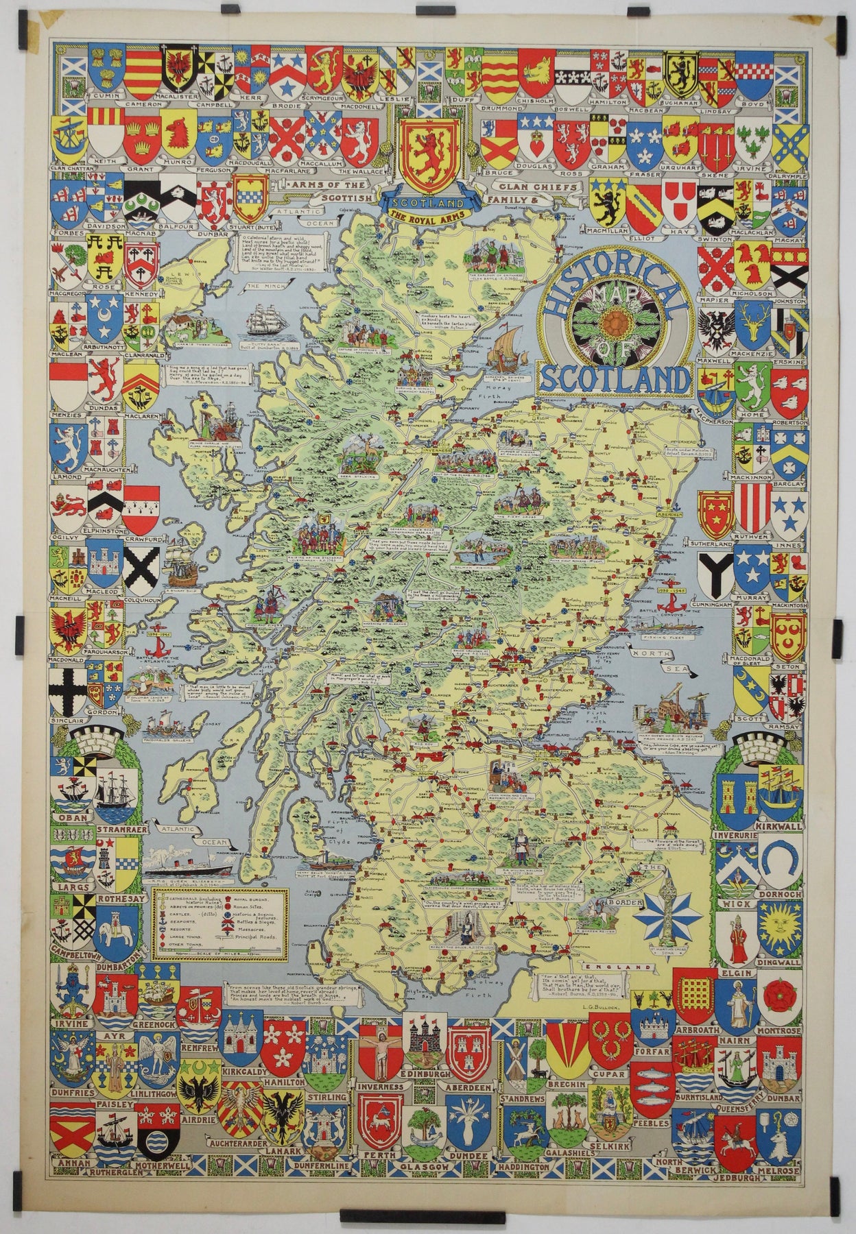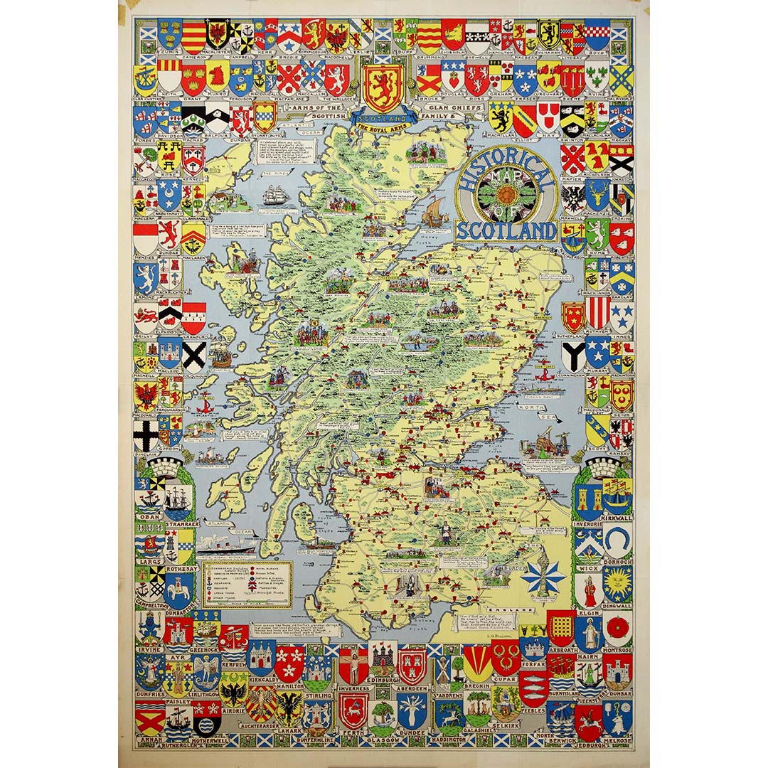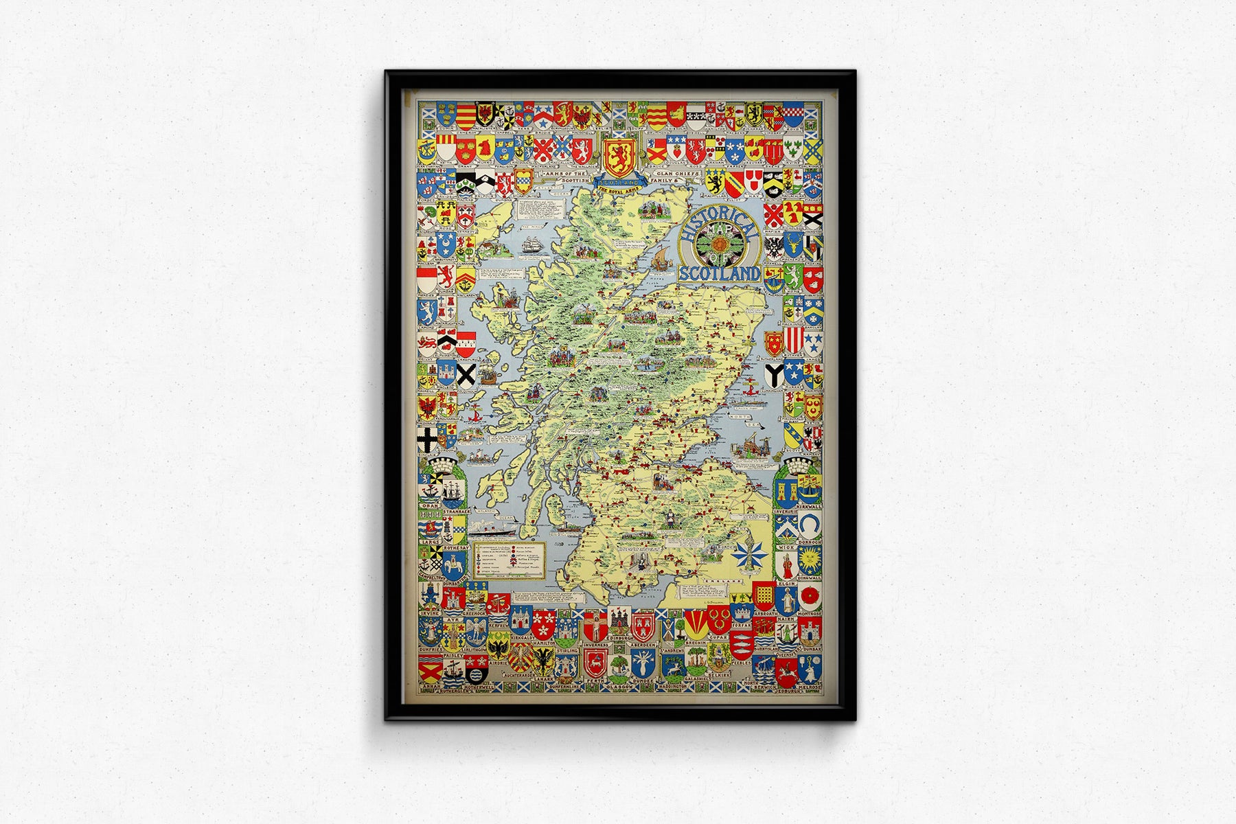 Au cœur de cette illustration se trouve une carte de l'Écosse finement ciselée, aux couleurs éclatantes et agrémentée de nombreuses vignettes représentant des sites historiques, des batailles célèbres et des monuments régionaux. Châteaux, cathédrales, navires et figures emblématiques de l'histoire écossaise s'intègrent harmonieusement à la géographie, transformant la carte en un récit visuel plutôt qu'en un document purement technique. Autour de cette image centrale se déploie une frise élaborée d'armoiries, représentant les clans, les familles nobles et les villes écossaises, célébrant ainsi les profondes traditions héraldiques et régionales de l'Écosse.