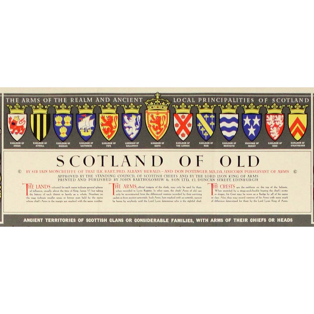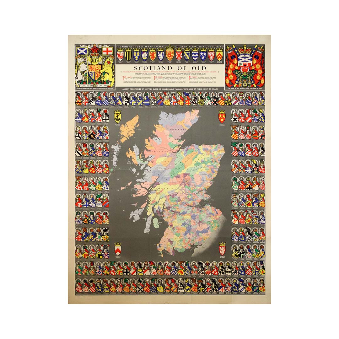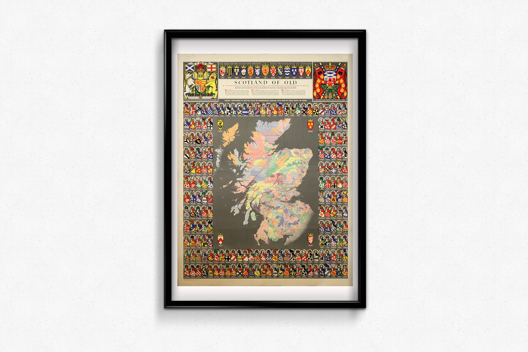 Réalisée durant une période de regain d'intérêt pour le patrimoine national et l'histoire des clans, « L'Écosse d'antan » témoigne de la renaissance, au milieu du XXe siècle, de la cartographie picturale et héraldique. Aujourd'hui, cette affiche est très recherchée par les collectionneurs de cartes, d'héraldique et d'histoire écossaise. Elle demeure un exemple frappant de la manière dont la cartographie, l'art et la généalogie peuvent se fondre en une œuvre unique, à la fois pédagogique, symbolique et d'une grande force visuelle.