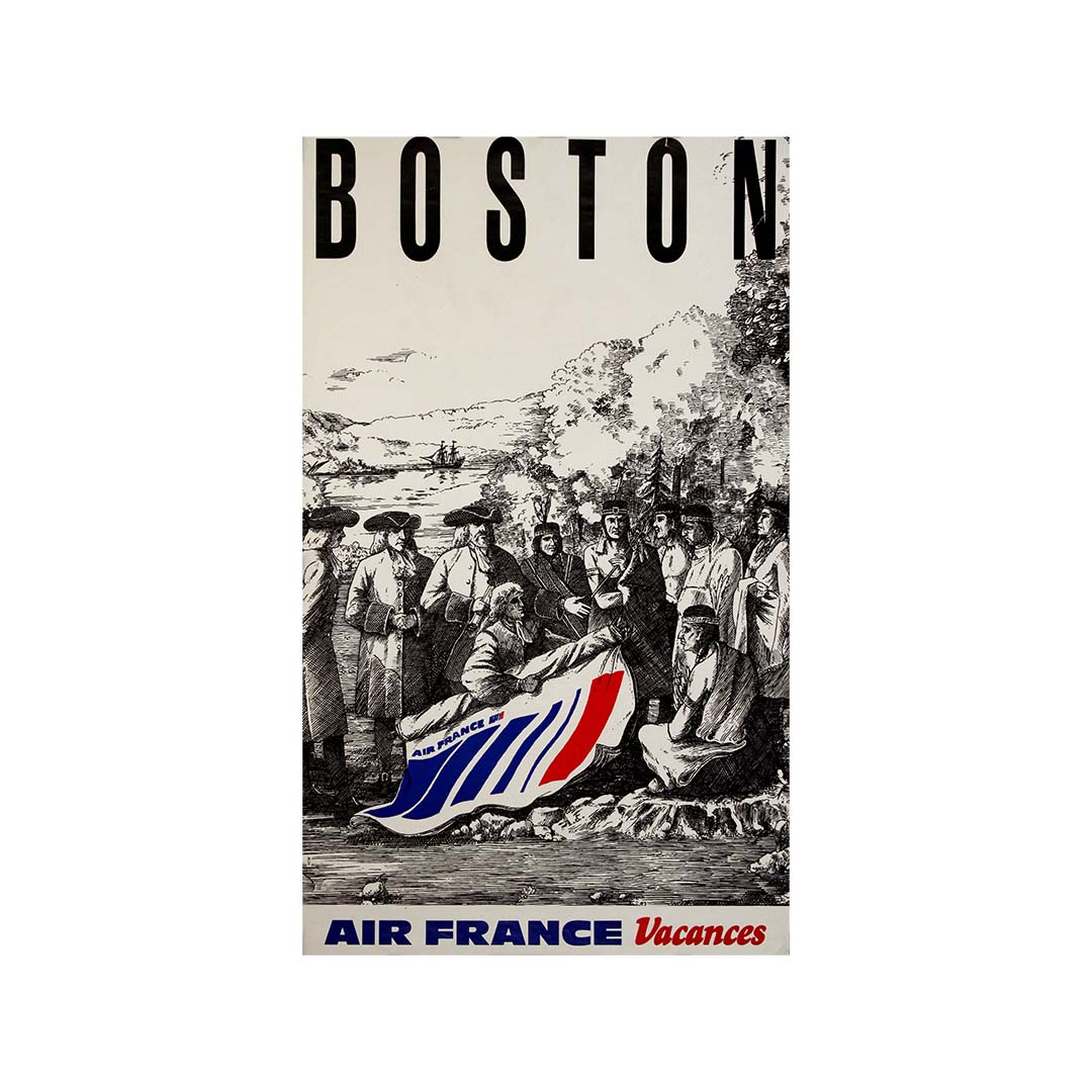 The effect is humorous and clever—a visual pun on travel, time, and tradition. It suggests that Air France not only bridges continents but eras, whisking travelers across both geographical and historical landscapes. The tagline “Vacances” (French for holidays) further infuses the composition with a light, leisurely tone, suggesting that even Boston, rich in Revolutionary lore, can be part of a relaxing and cosmopolitan French vacation.