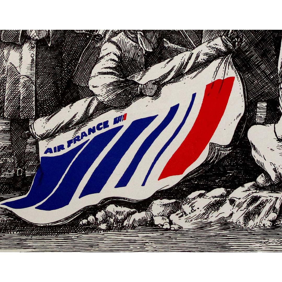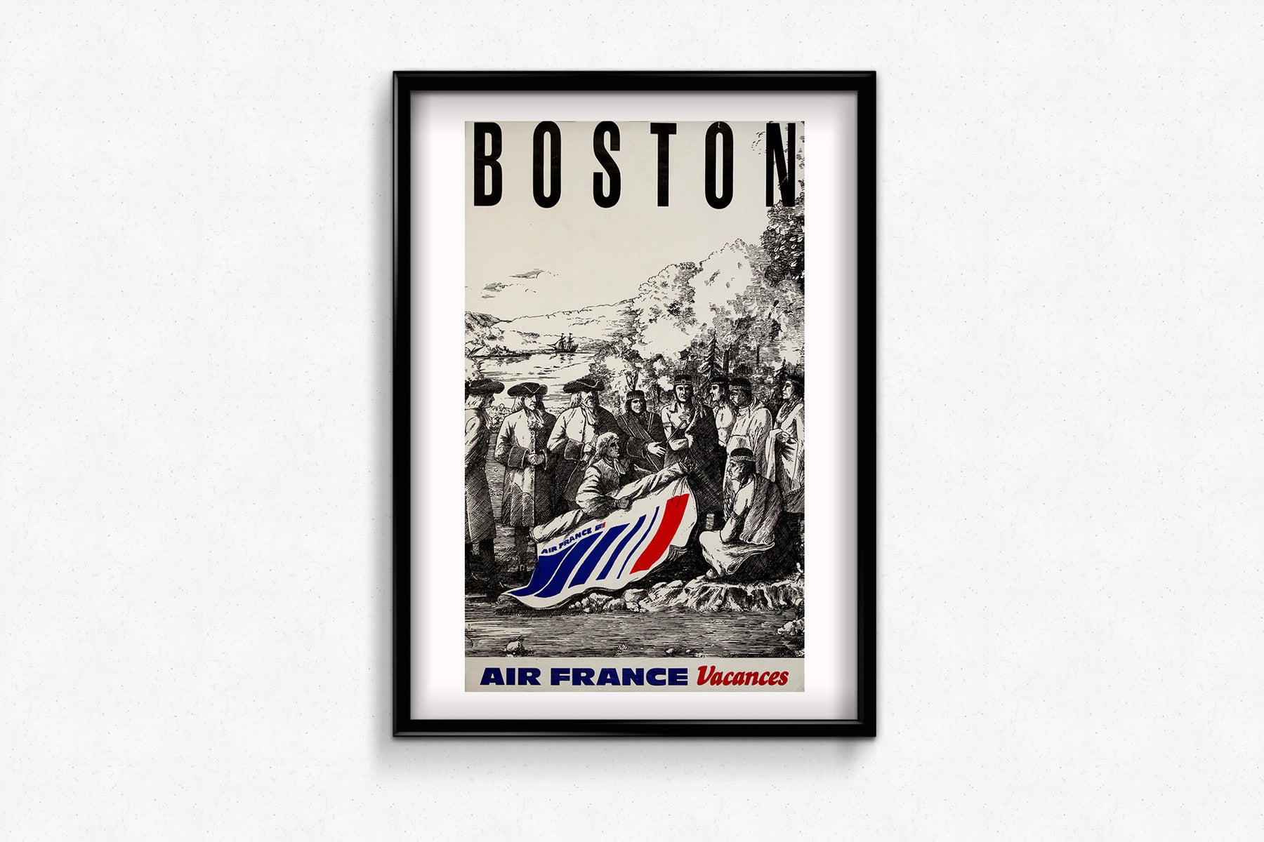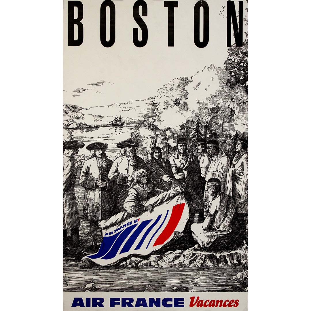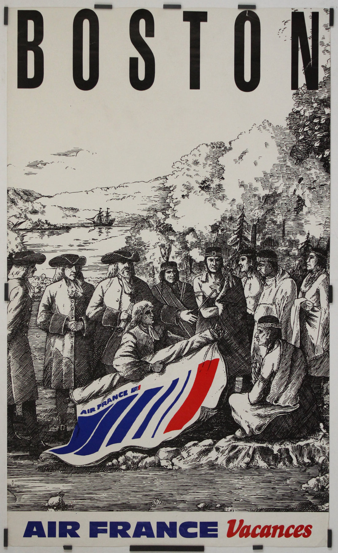 Witty, unexpected, and delightfully anachronistic, this circa 1970 original travel poster for Air France Vacances blends colonial history with modern branding in a uniquely playful composition. Designed to promote Boston as a tourist destination, the poster juxtaposes a classic 17th-century engraving-style scene—presumably depicting early New England settlers and Native Americans—with a bold, contemporary twist: a draped Air France logo rendered in the airline’s signature tricolor.