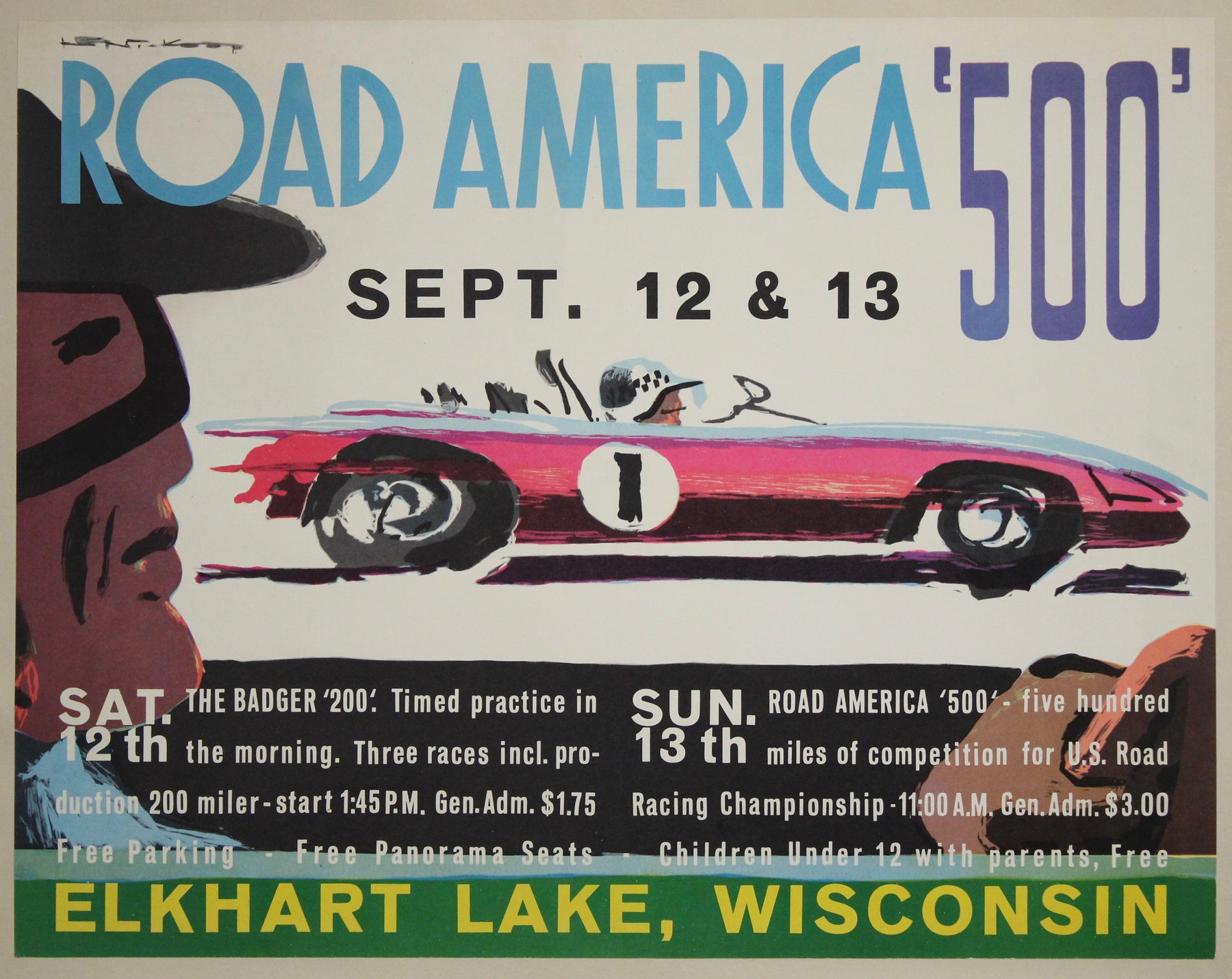 This vibrant 1964 original poster for the Road America “500” captures the spirit of American road racing at a pivotal moment in the sport’s history. Designed by Kent Koop, one of the most inventive poster artists working in U.S. motorsport promotion, the poster announces the September 12–13 race weekend at Road America in Elkhart Lake, Wisconsin, one of North America’s most storied permanent road circuits.