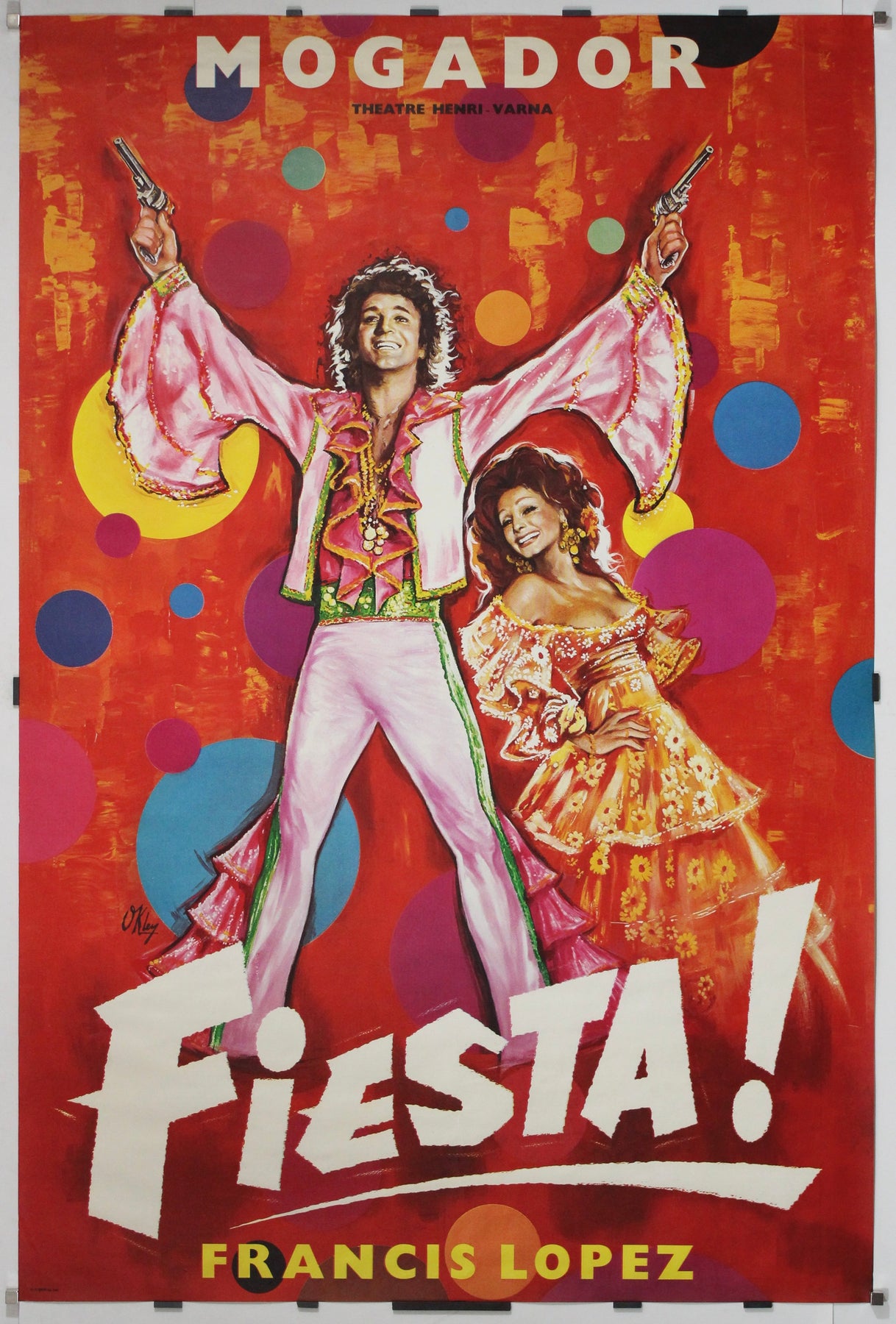 Exploding with rhythm, color, and Latin flair, this 1975 original poster by artist Okley captures all the spirit and spectacle of Fiesta!, a musical by legendary French-Spanish composer Francis Lopez, known for his exuberant operettas.