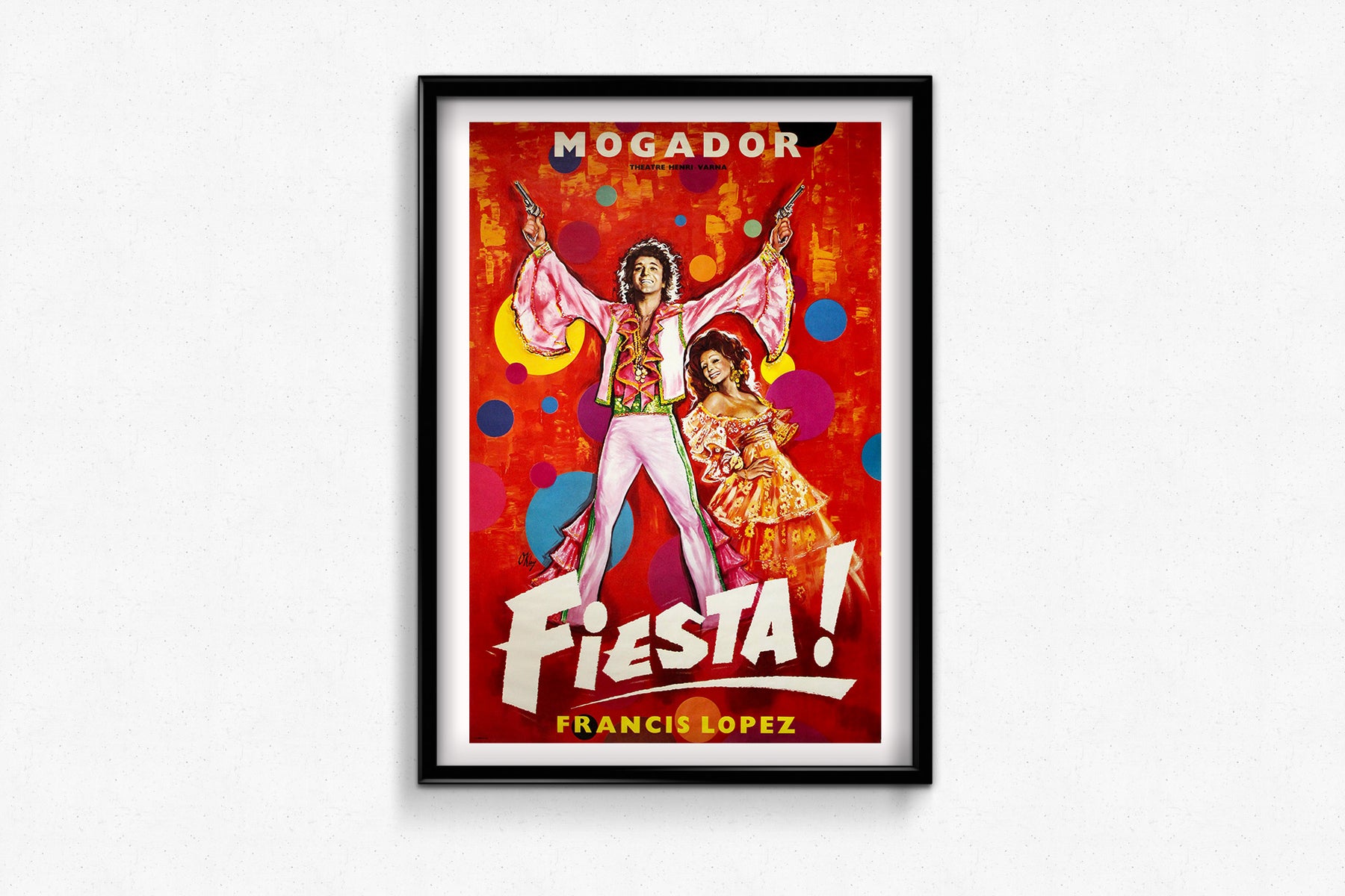 Commissioned for Théâtre Mogador—under the direction of Henri Varna—the poster channels the visual energy of the performance with dazzling reds, saturated polka dots, and two dazzling stars caught mid-celebration. The central figures, dressed in flamboyant, sequin-lined flamenco-style costumes, radiate joy, with the leading man holding pistols in the air like castanets of drama and the leading lady poised in a classic dancer's flourish.