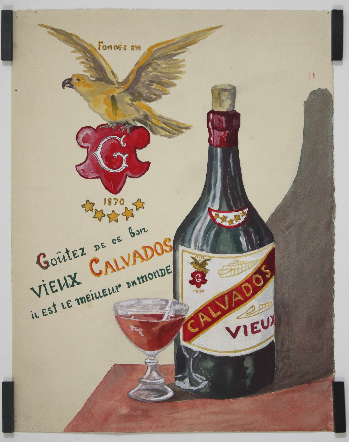 Rustic, vibrant, and undeniably French, this charming circa 1940 original painting captures the nostalgic warmth of local advertising through gouache and watercolor. Celebrating Calvados, the famous apple brandy from Normandy, the composition exudes handmade authenticity and provincial pride — a far cry from the mass-produced posters of the post-war commercial boom.