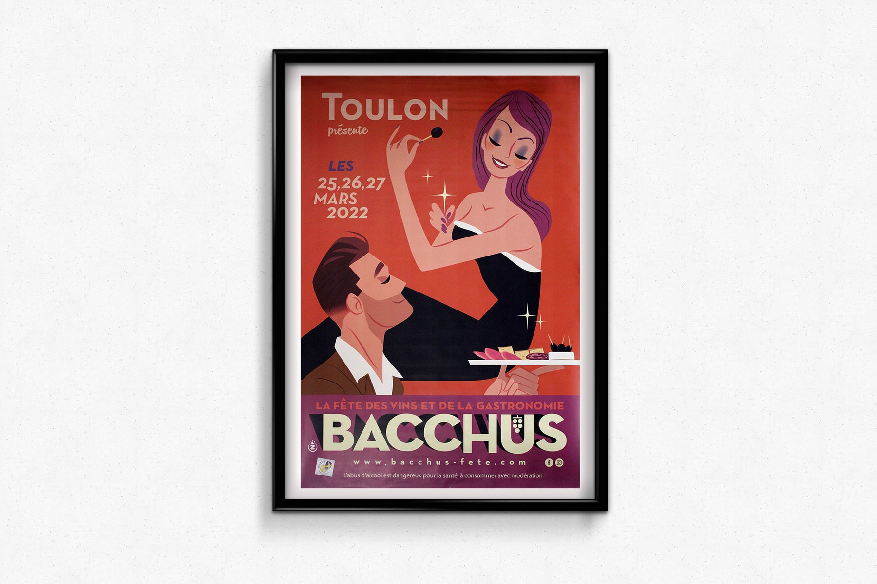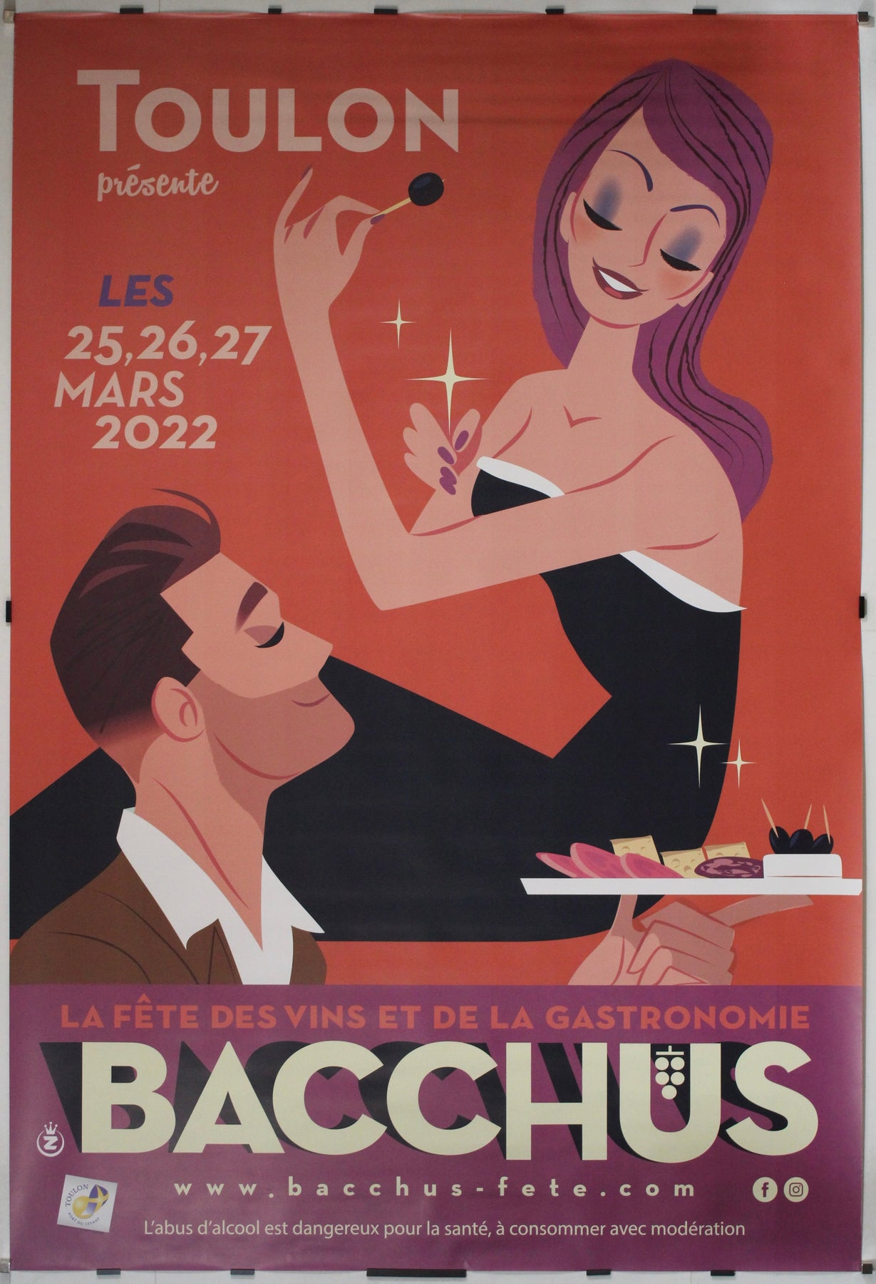 This vibrant 2022 original poster announces the Bacchus festival, held in Toulon from March 25 to 27, and illustrated in unmistakable style by French graphic artist Monsieur Z. Known for his retro-futurist aesthetic and sleek mid-century-inspired design, Monsieur Z captures the spirit of French joie de vivre with bold color, stylized figures, and impeccable elegance.