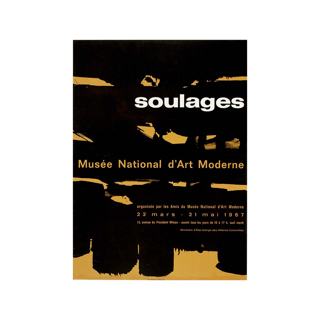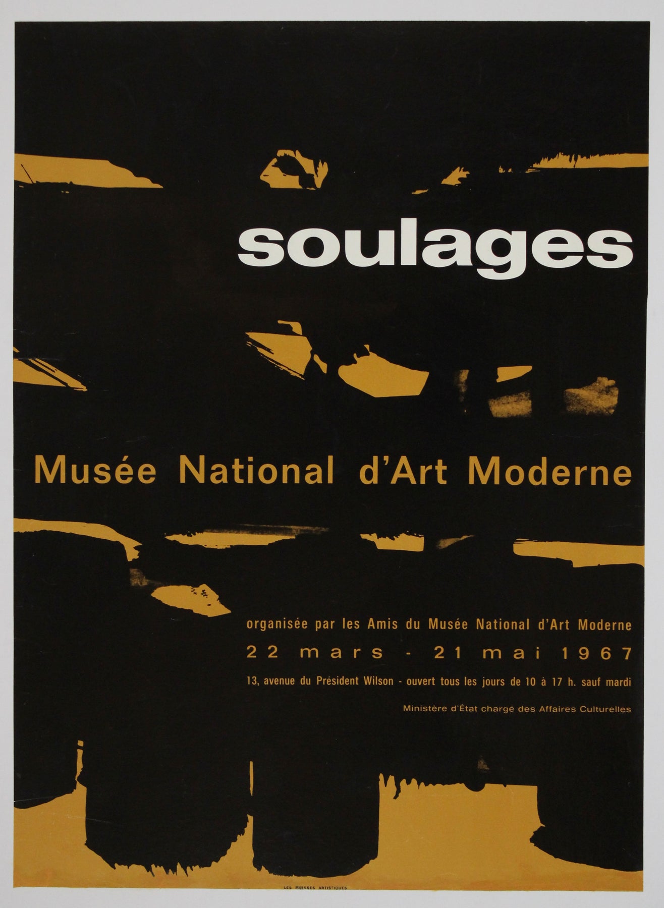 Cette affiche lithographique originale de 1967 a été créée par Pierre Soulages pour promouvoir son exposition majeure au Musée national d'Art moderne de Paris. Présentée du 22 mars au 21 mai 1967, cette exposition a marqué un tournant décisif dans la reconnaissance internationale croissante de l'artiste français.