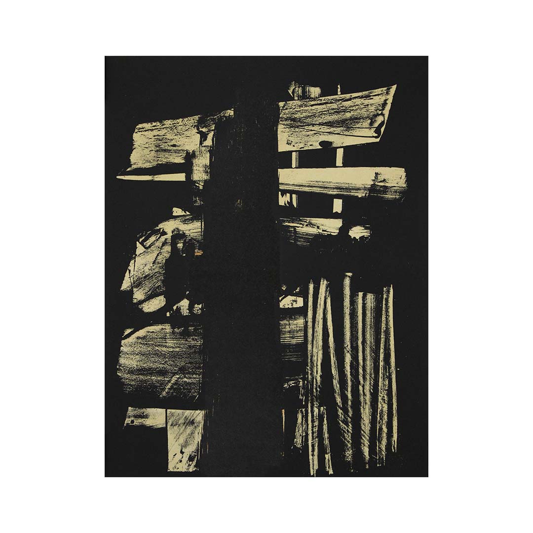 Cette saisissante lithographie originale de Pierre Soulages a été publiée en 1959 dans la célèbre revue d'art XXème Siècle , pilier de l'édition d'art européenne de l'après-guerre. Imprimée par les légendaires Ateliers Mourlot à Paris, cette édition de 2 000 exemplaires saisit l'essence des premières recherches de Soulages sur la lumière, la densité et le contraste, notamment grâce à son utilisation caractéristique du noir.