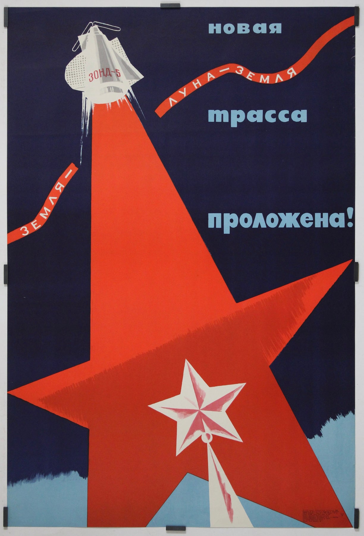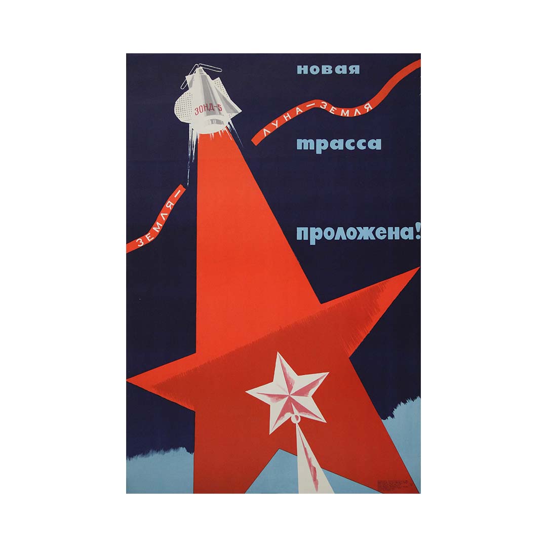 This impressive 1968 original Soviet poster by O. Maslyakov celebrates one of the milestones of the Space Age with the triumphant slogan: “New Moon–Earth route paved!” The poster refers to the achievements of the Soviet Zond programme, which successfully carried out circumlunar missions during the late 1960s, marking a crucial step in deep-space exploration. At the top of the composition, a spacecraft streaks across the dark blue cosmos, leaving behind a bold red path that connects the Moon and Earth—transformed here into a powerful visual metaphor of technological conquest and scientific progress.
