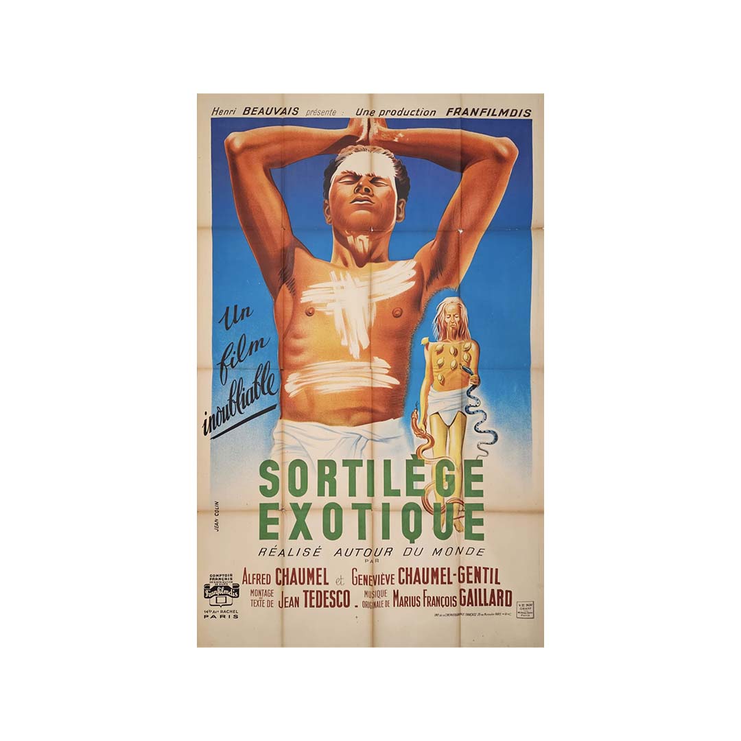 This original 1942 cinema poster was designed by Jean Colin for the film Sortilège exotique, a visually striking travel documentary produced during the Second World War. The poster is a powerful example of French illustrated cinema advertising from the early 1940s, combining sensuality, mysticism, and escapism at a time when audiences longed for distant horizons.