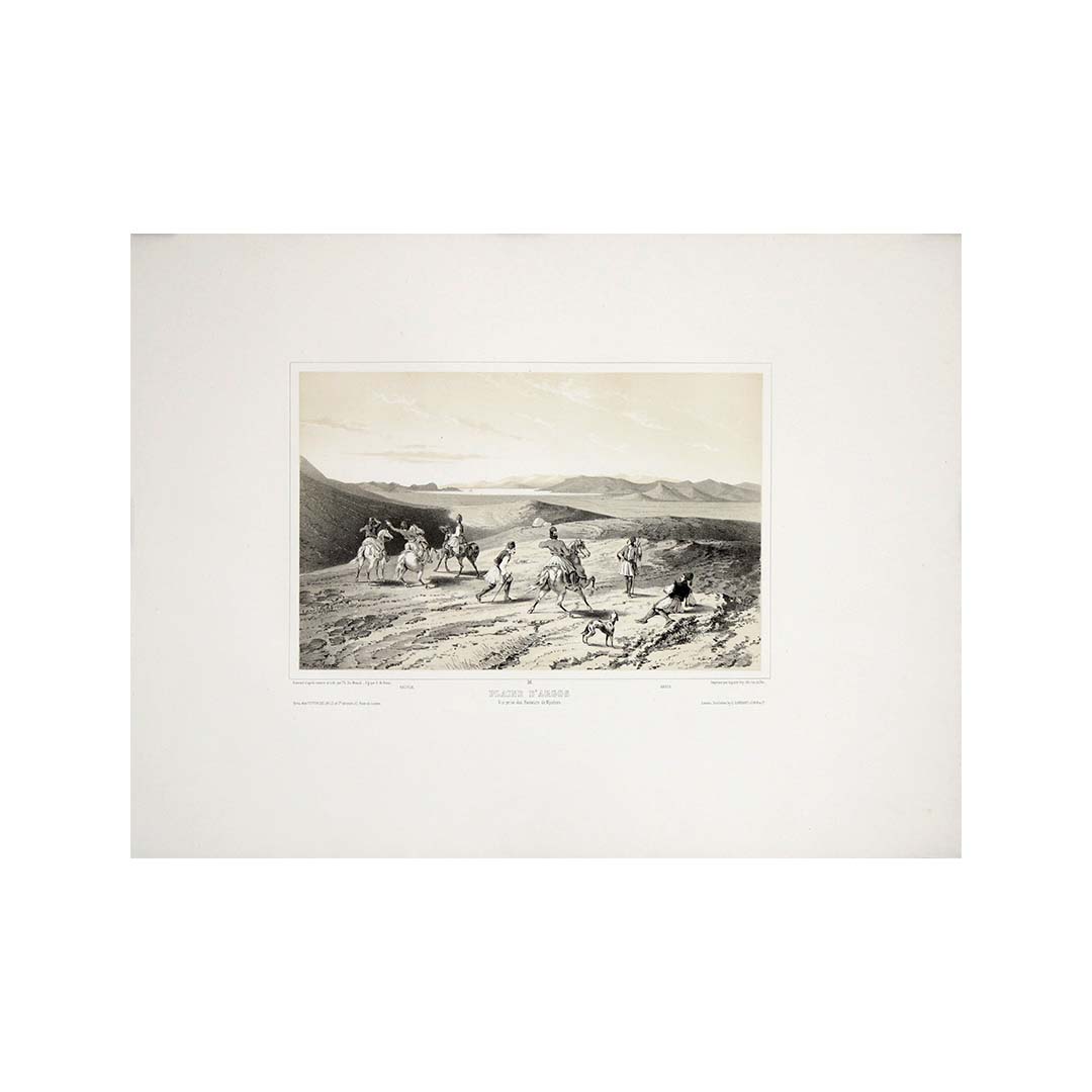 This 1846 original lithographic engraving after Théodore Du Moncel depicts the Plain of Argos seen from the Heights of Mycenae (Plaine d’Argos vue prise des hauteurs de Mycènes), and belongs to the celebrated publication Athènes monumentale et pittoresque. Produced during the nineteenth century’s renewed European fascination with classical Greece, the series aimed to document the landscapes, monuments, and archaeological heritage that shaped Western historical imagination.