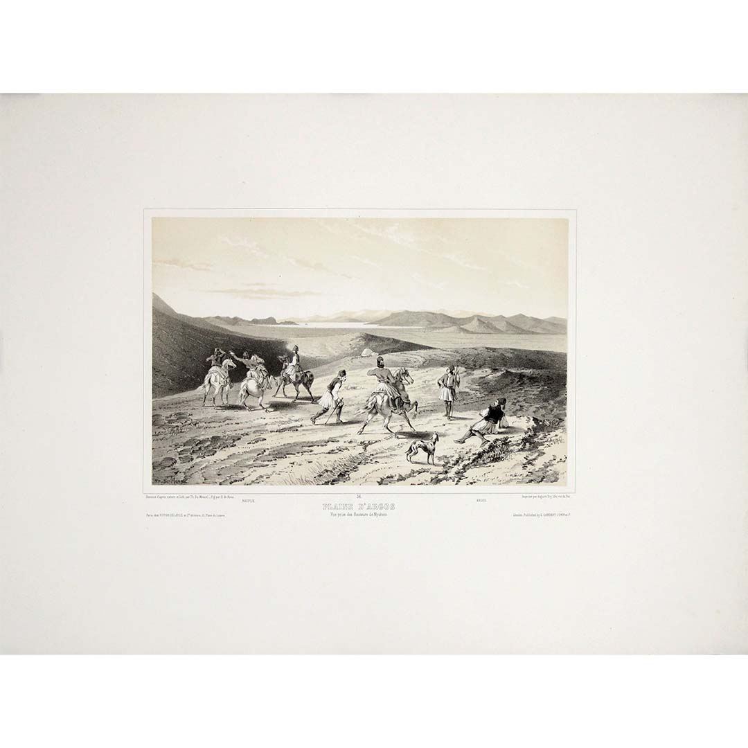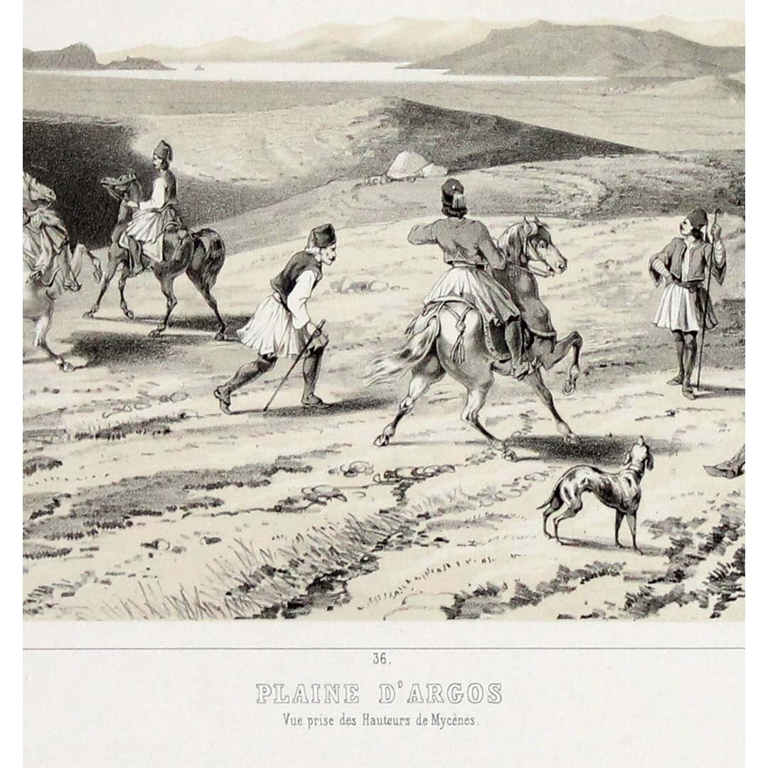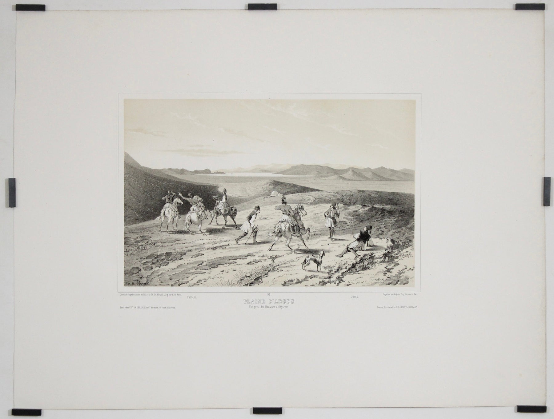 The composition offers a sweeping panoramic view across the Argive plain, historically one of the most significant regions of ancient Greece. From the elevated vantage point near Mycenae — legendary seat of Agamemnon — the scene combines archaeological awareness with Romantic landscape sensibility. Figures on horseback and on foot, rendered by H. de Rossi, animate the foreground and emphasize both scale and the spirit of nineteenth-century exploration.
