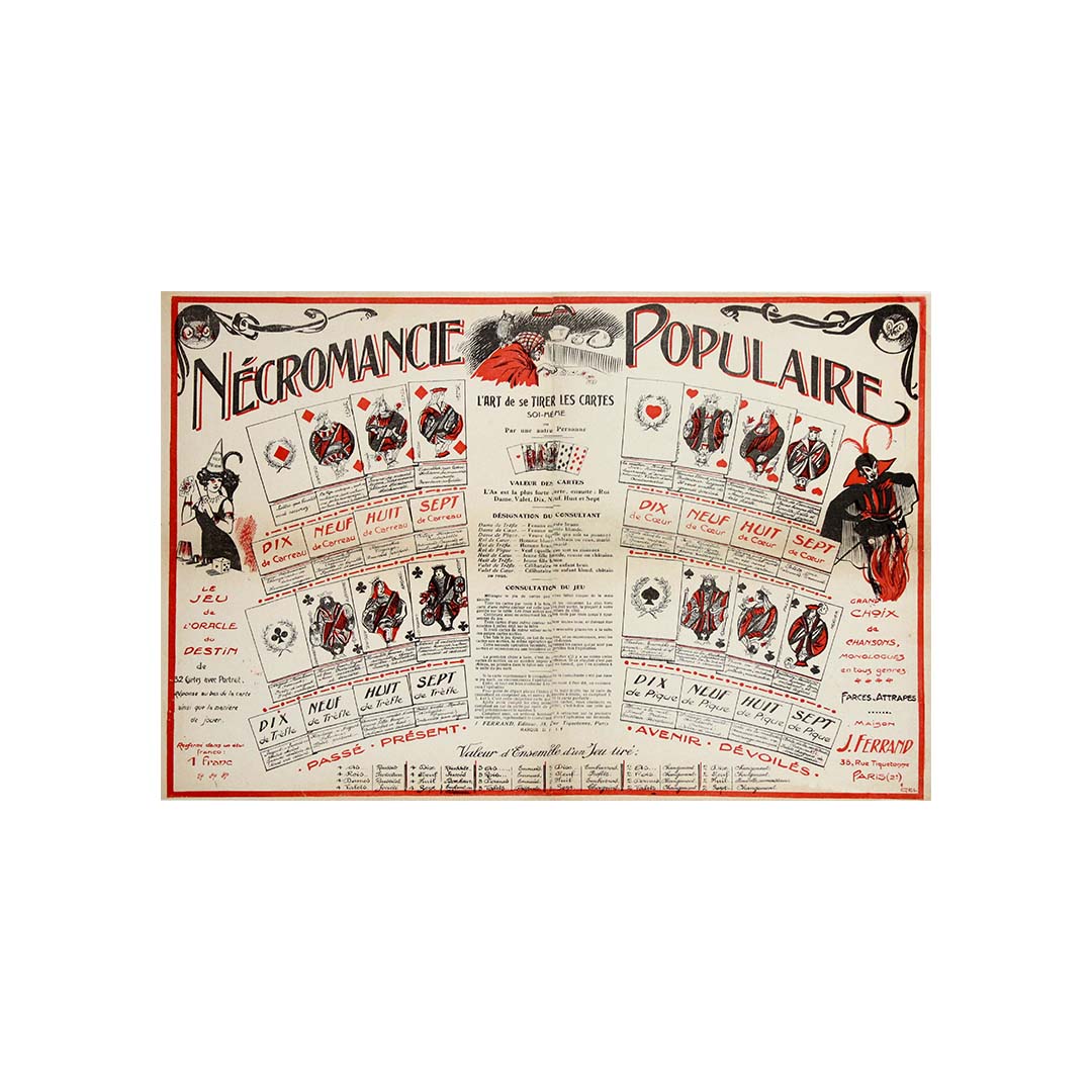 Despite the dramatic term “nécromancie,” the content generally relates to card divination rather than literal necromancy, highlighting how occult themes were frequently romanticized in popular visual culture. It illustrates a time when spiritualism, tarot reading, and mystical games were fashionable pastimes across Europe.