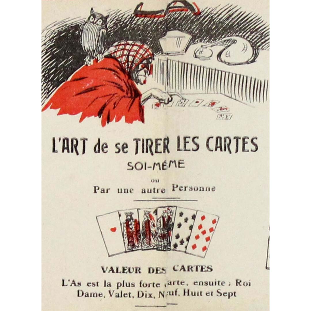 The composition combines instructional charts with theatrical imagery — playing cards, symbolic figures, and decorative flourishes typical of the Art Nouveau period. Such posters were often sold as affordable curiosities, enabling people to practice simple fortune-telling at home while enjoying the spectacle of esoteric imagery.