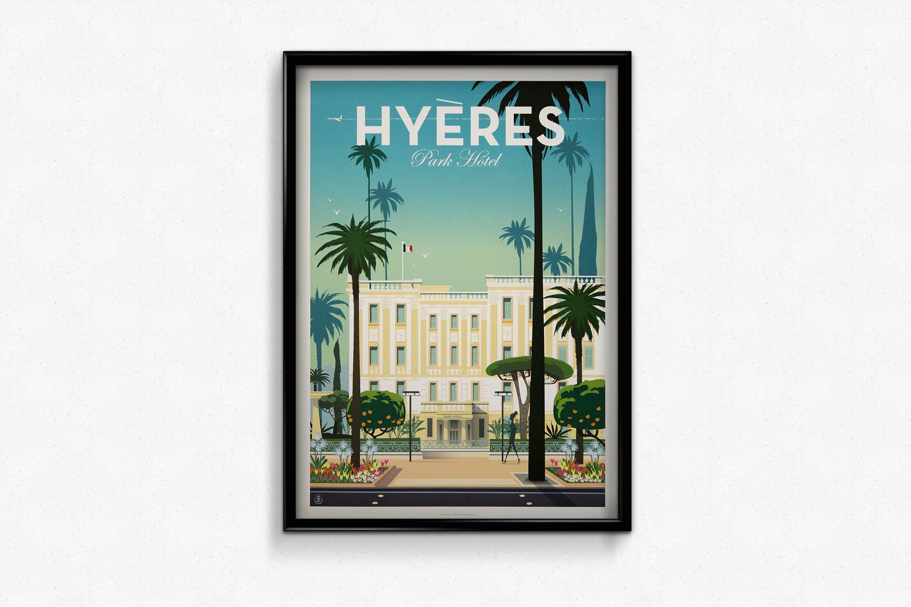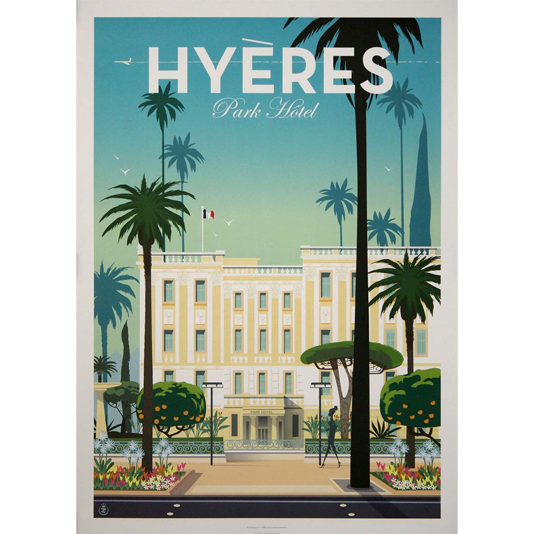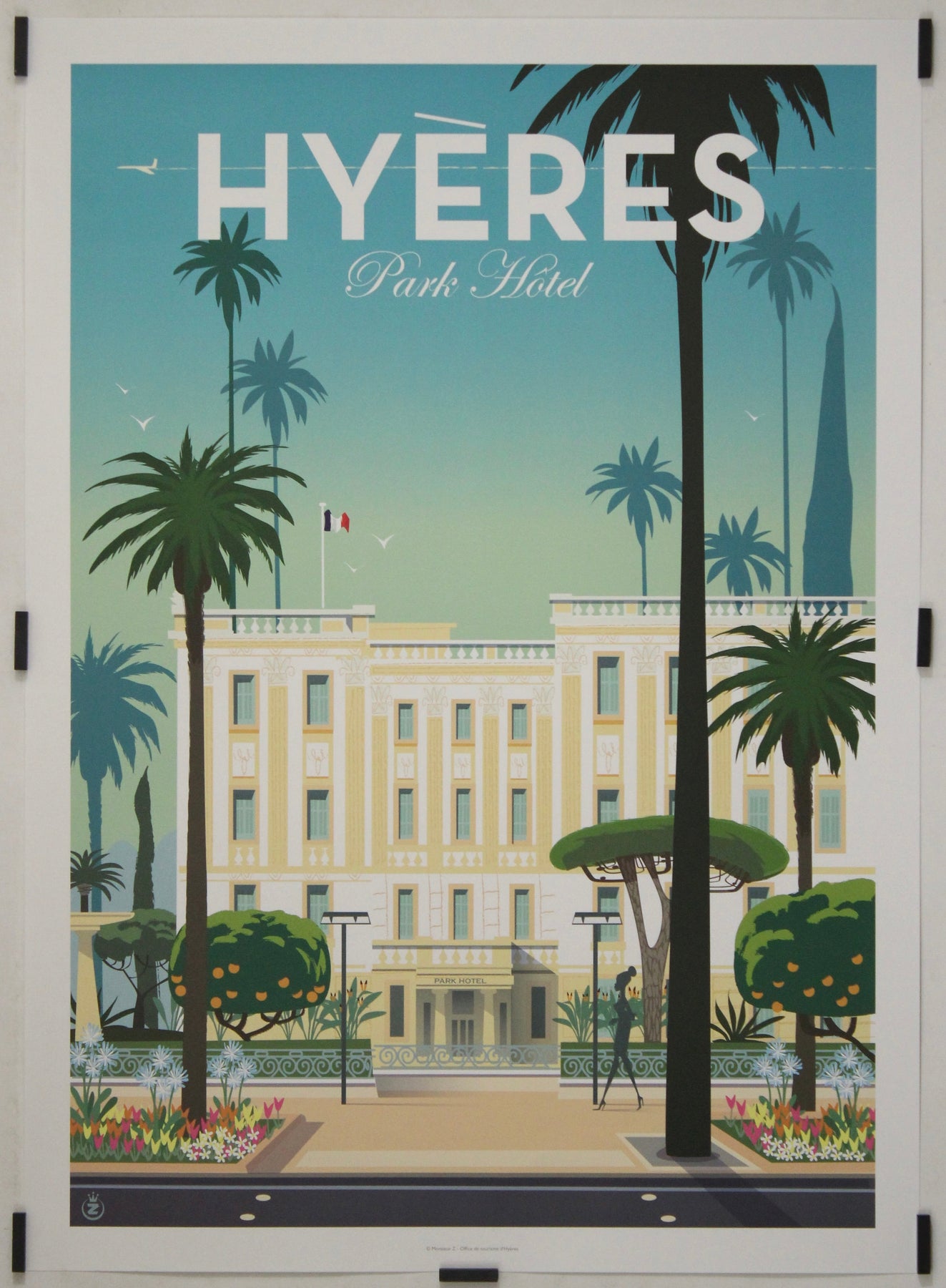 The composition presents the Park Hotel in Hyères framed by tall palm trees, lush gardens, and a serene turquoise sky. The architecture, rendered with clean lines and soft pastel tones, recalls the elegance of Belle Époque and early modernist resorts. The atmosphere is deliberately timeless: a vision of leisure, light, and refined Mediterranean living, designed to awaken both nostalgia and desire for escape.