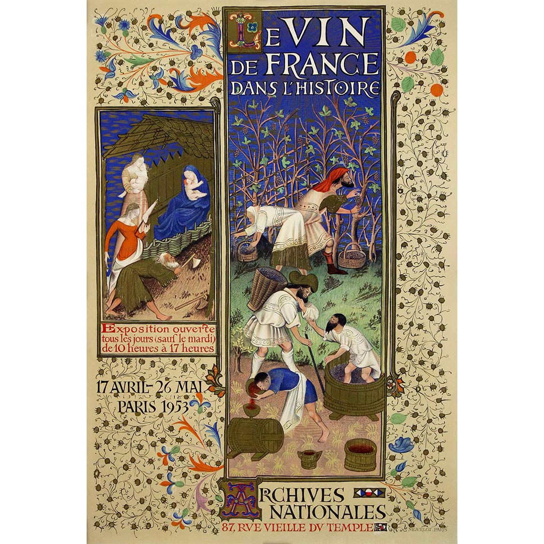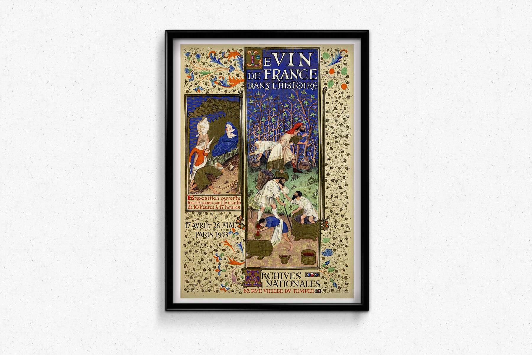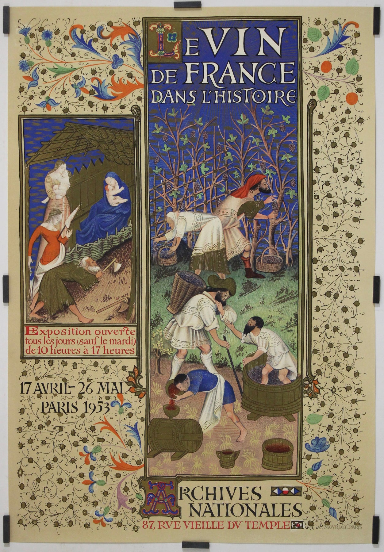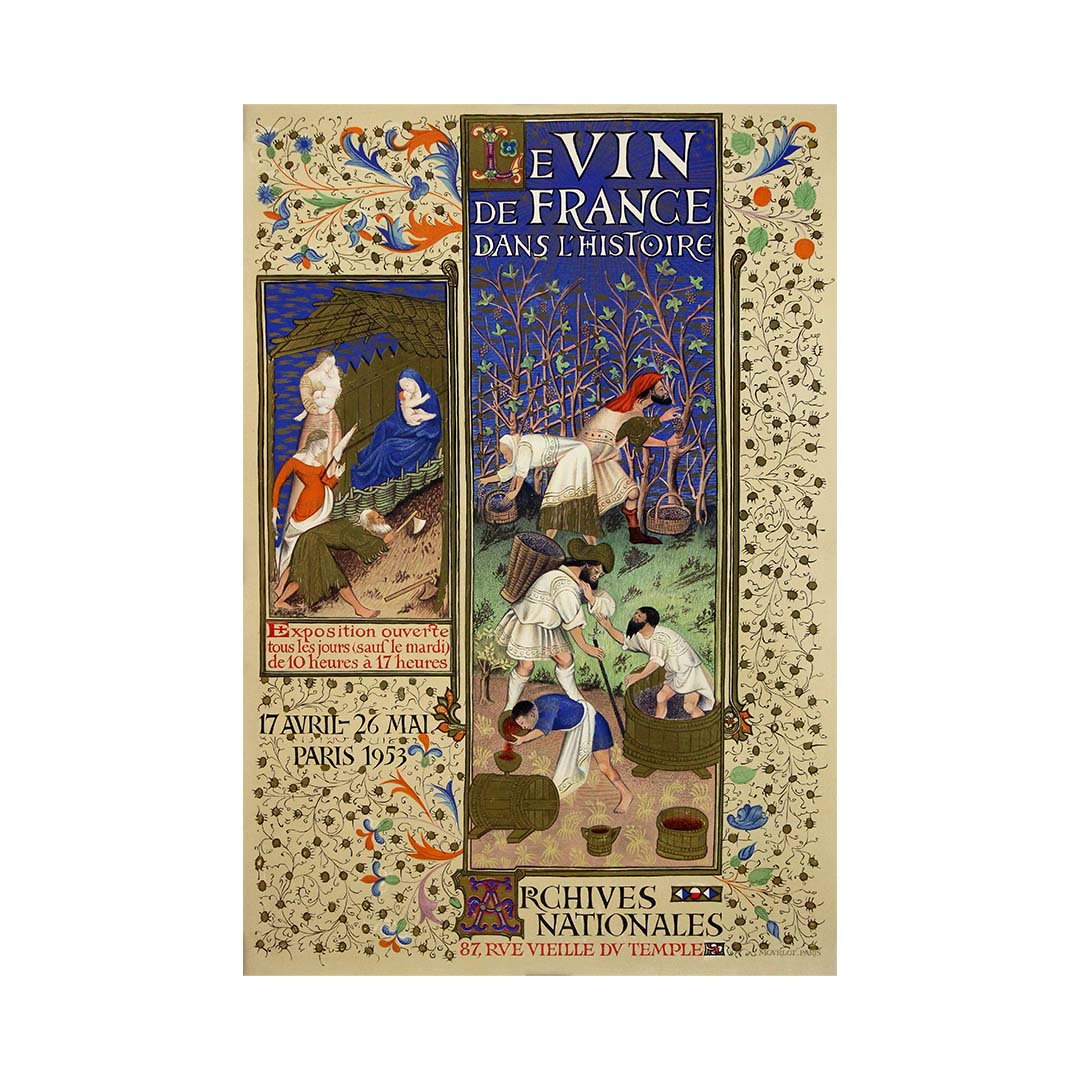 Created in 1953 for an exhibition held at the Archives Nationales, this refined poster celebrates the deep historical roots of French wine culture. Designed in a deliberately medieval-inspired style, it echoes illuminated manuscripts, instantly situating wine not merely as a product, but as a civilizational heritage woven into the fabric of French history.
