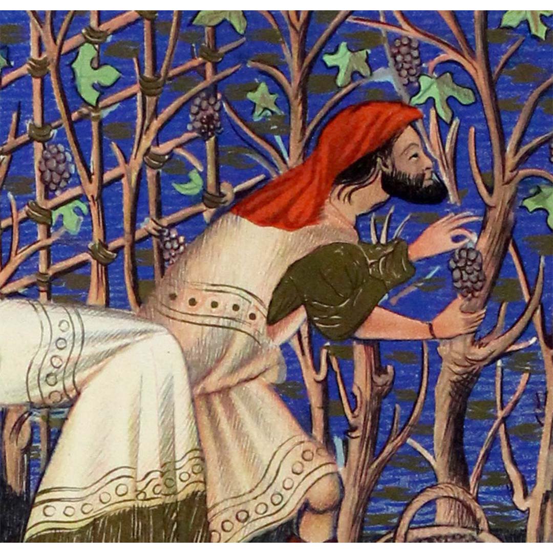 The composition is divided into richly decorated panels. At the center, scenes of grape harvesting, treading, and barrel filling evoke traditional winemaking practices passed down through centuries. The figures—dressed in stylized historical garments—suggest continuity from the Middle Ages to the modern era. On the left, a religious vignette recalls wine’s sacred symbolism, referencing its liturgical and spiritual significance alongside its everyday role.