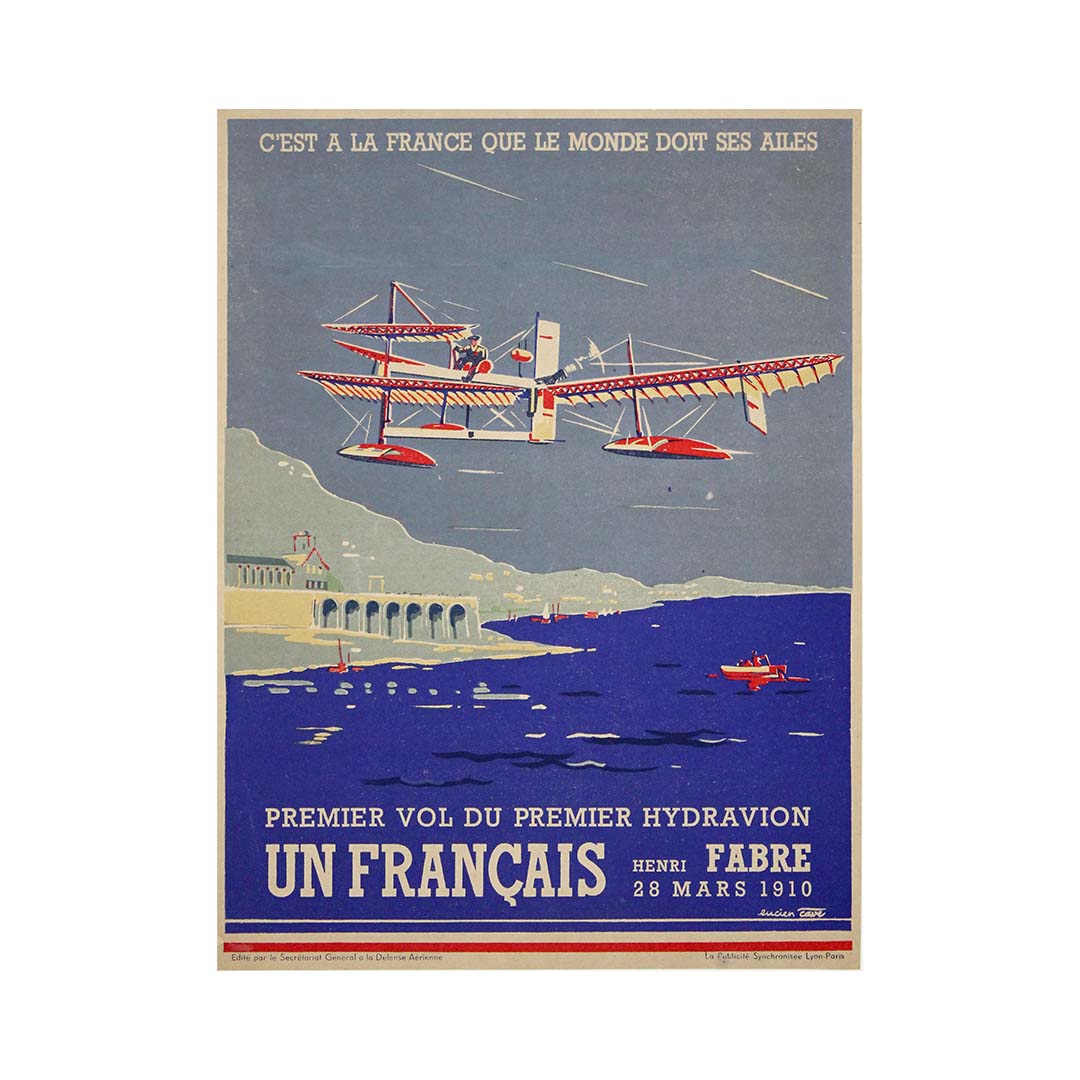 This striking circa 1930 original poster by Lucien Cave commemorates one of the foundational moments in aviation history: the first successful flight of a seaplane (hydravion) by the French aviation pioneer Henri Fabre on 28 March 1910. Created during a period when aviation achievements were becoming symbols of national pride, the poster celebrates France’s early leadership in aeronautical innovation.