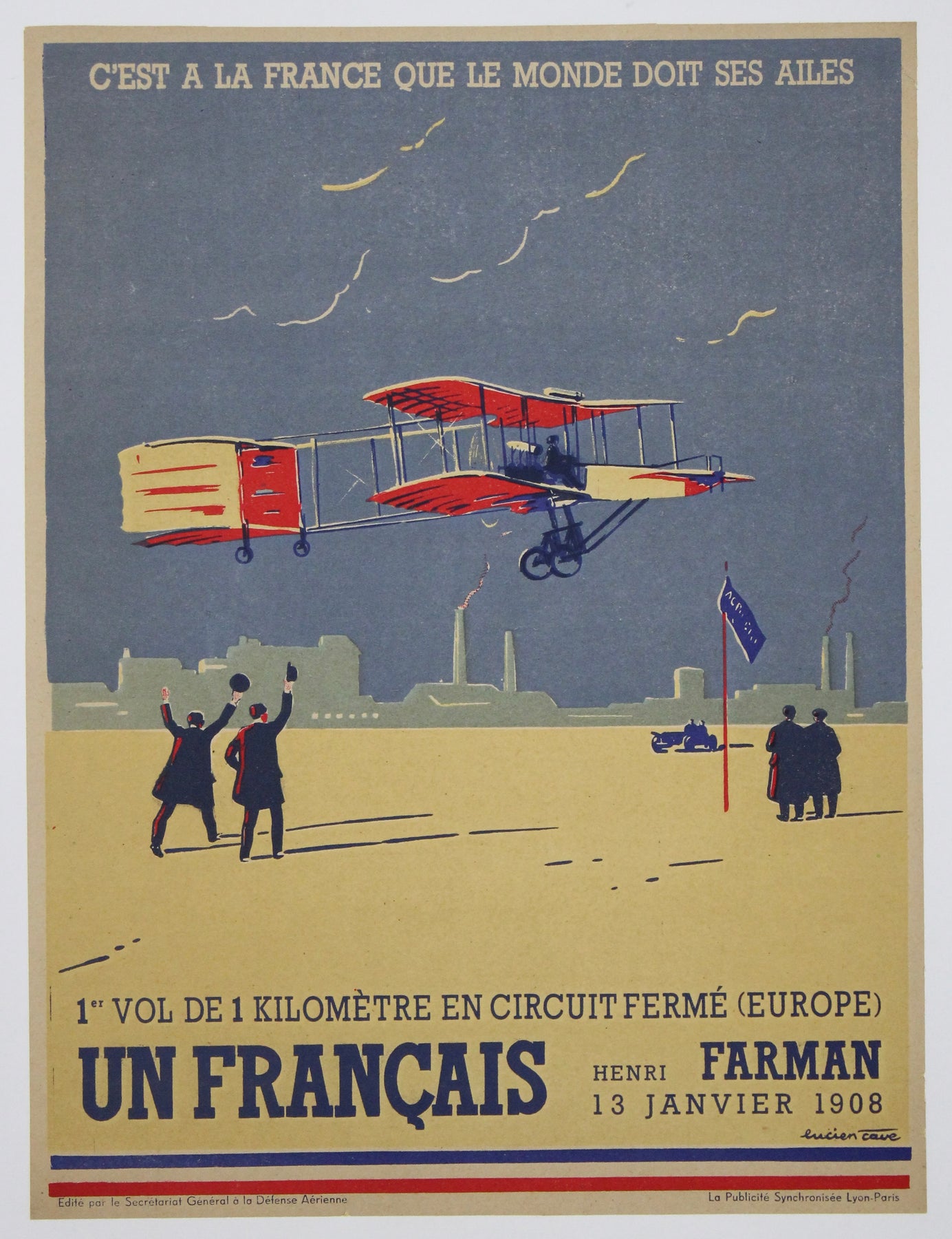 This circa 1930 aviation poster by Lucien Cave commemorates a landmark achievement in early powered flight: Henri Farman’s historic closed-circuit flight of one kilometre on 13 January 1908, one of the first controlled sustained flights in Europe. Produced during the interwar period, the poster reflects France’s pride in its pioneering role in aviation history.