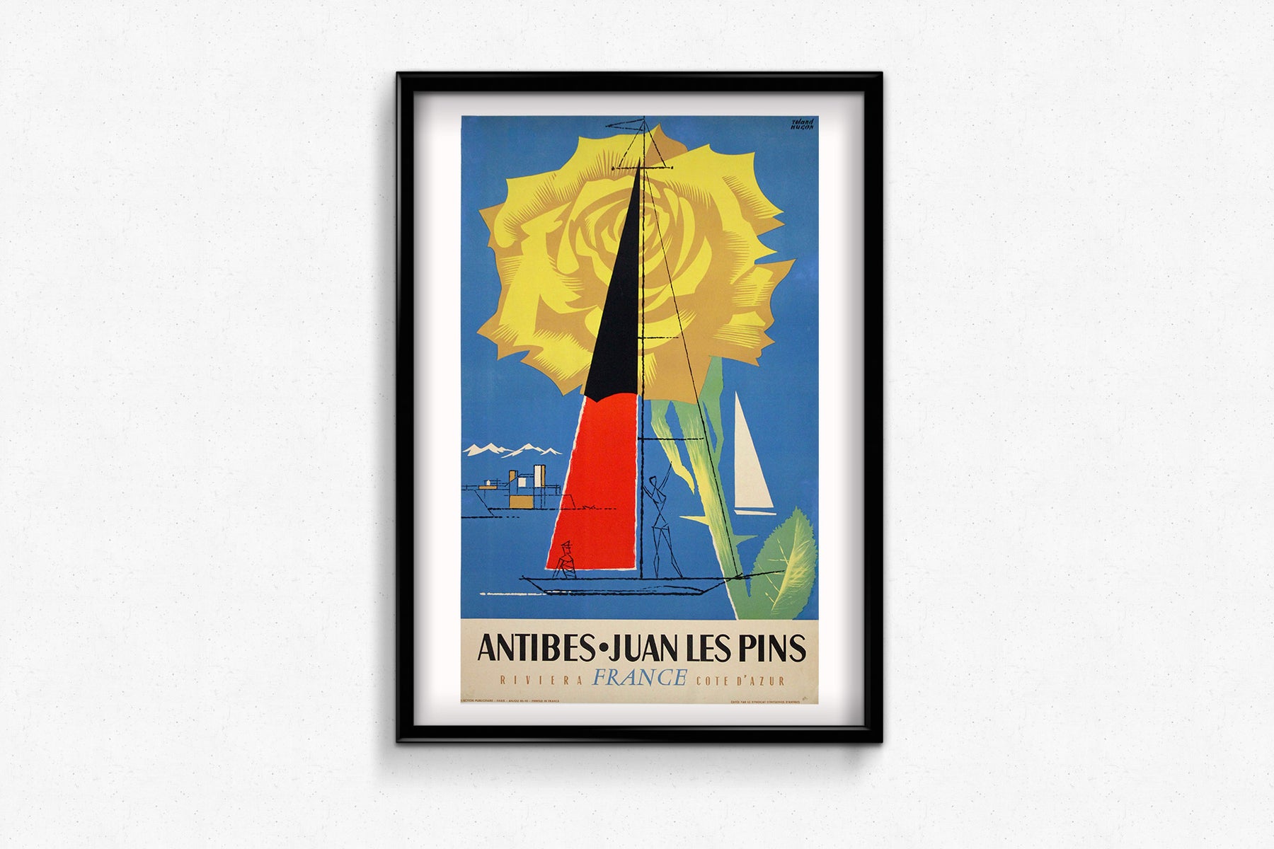 Created during a period when the Côte d’Azur was reasserting itself as a premier international destination, the poster embodies the allure of seaside leisure, sailing, and artistic sophistication. It presents the Riviera not just as a place, but as an experience—bright, modern, and full of possibility.