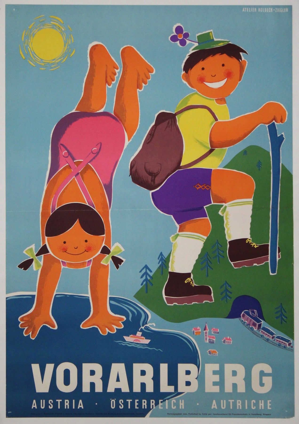 This lively circa 1950 travel poster, designed by Atelier Kolbeck & Ziegler, promotes tourism in the scenic alpine region of Vorarlberg. The poster captures the joyful spirit of outdoor adventure and family travel that characterized mid-twentieth-century tourism campaigns across Europe.