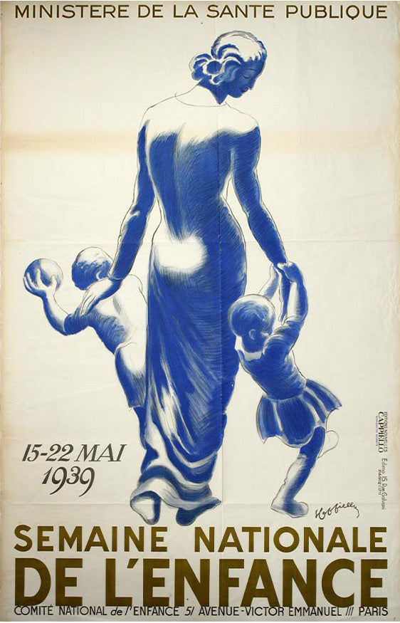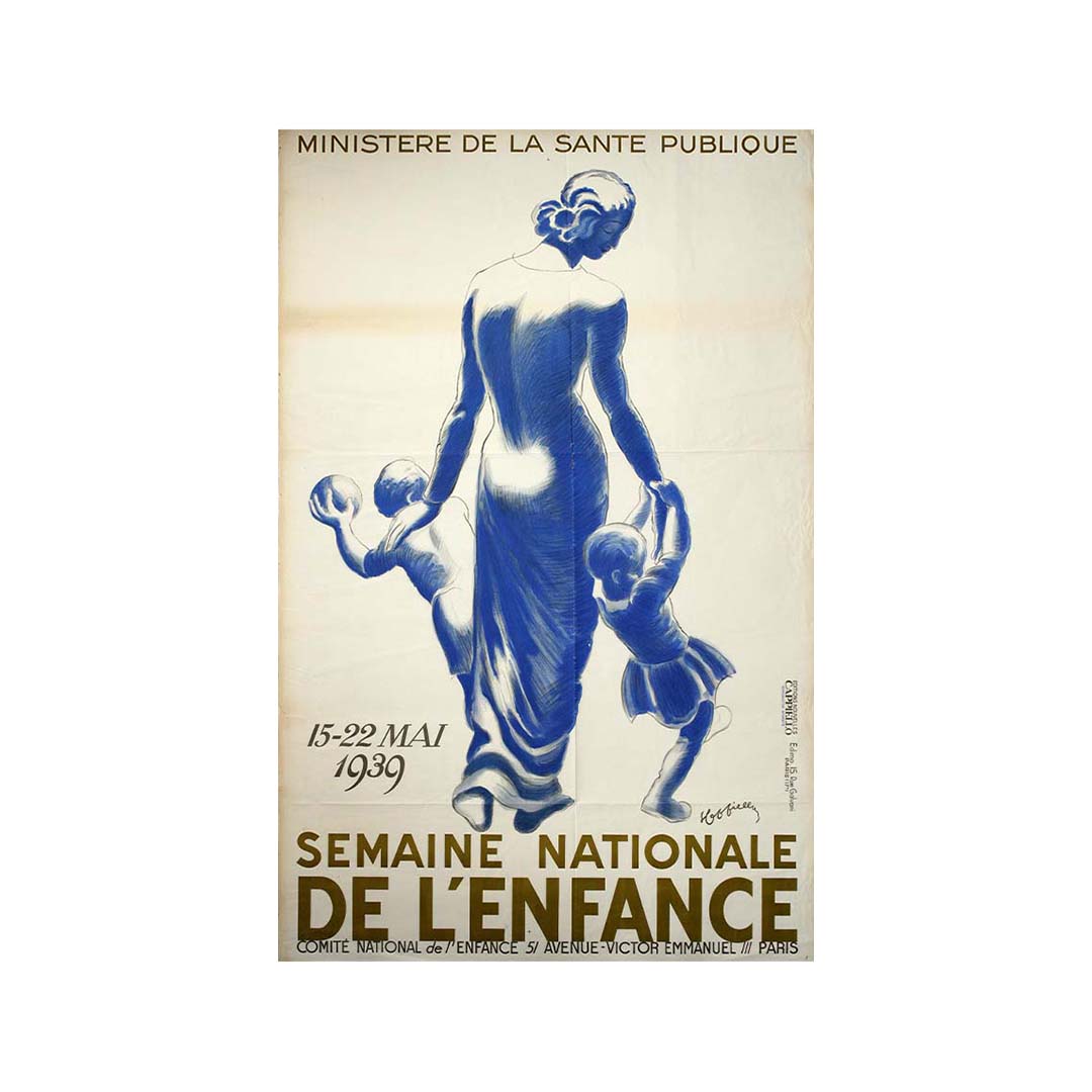 This moving 1939 original poster by renowned Italian-French poster artist Leonetto Cappiello was commissioned by the Ministère de la Santé Publique for the Semaine Nationale de l’Enfance (National Children’s Week), held from 15 to 22 May 1939. Designed in the late interwar years, the work reflects both the urgency and idealism of France’s social health campaigns on the eve of WWII.