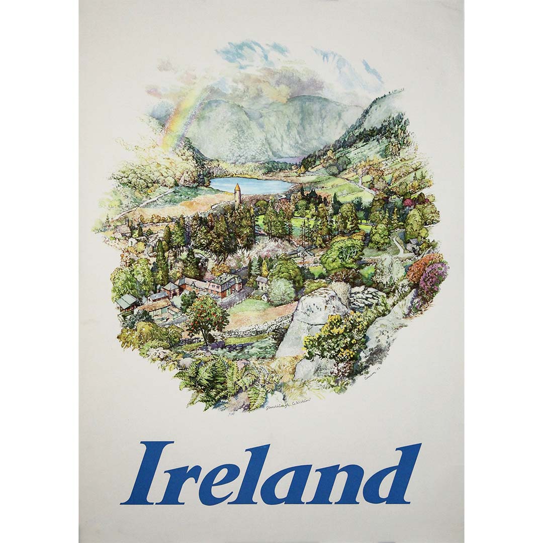 This beautifully illustrated 1952 original poster captures the breathtaking charm of Glendalough, one of Ireland’s most historically and spiritually significant locations. Created by British artist and Royal Academician Raymond Teague Cowern, this work was commissioned by the Irish Tourist Association as part of its post-war campaign to promote tourism through evocative fine art.