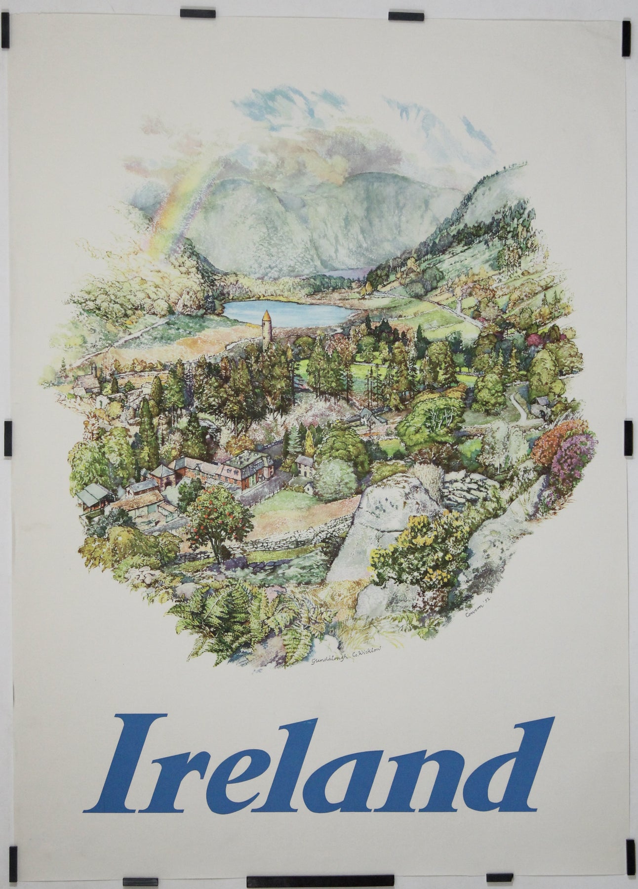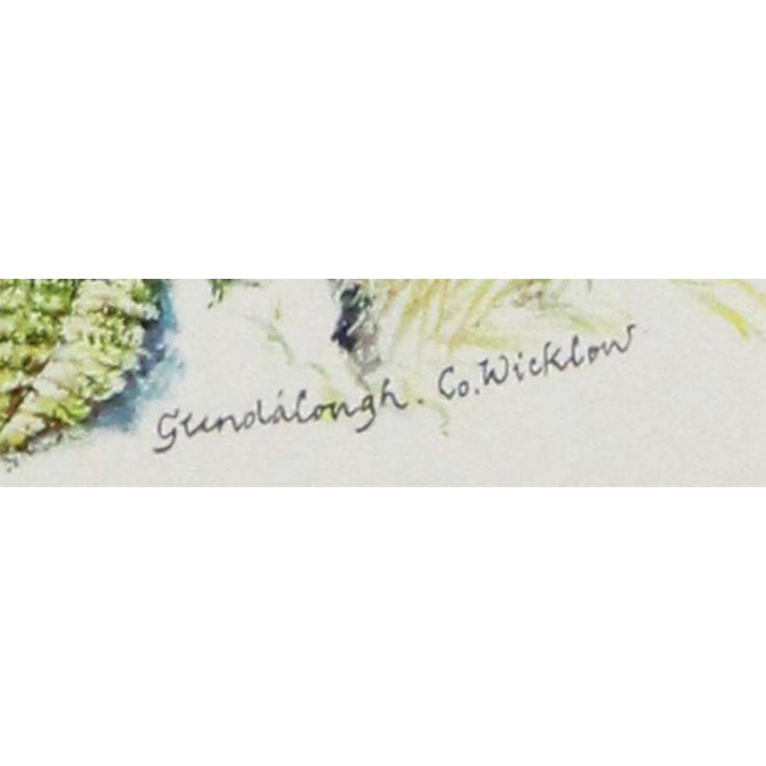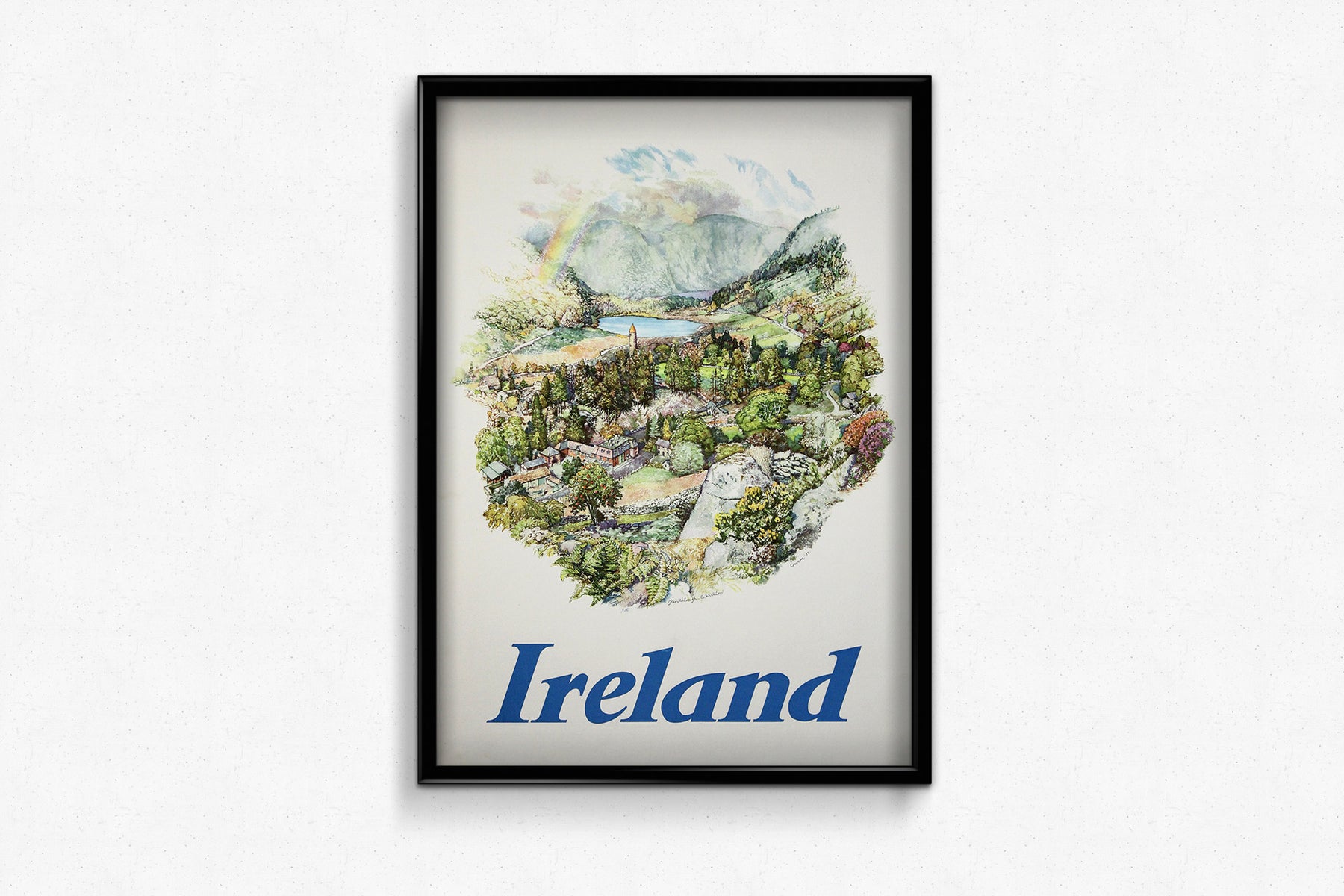 Set in County Wicklow, Glendalough—meaning “Valley of the Two Lakes”—is steeped in monastic history and ancient legend. Cowern’s lush and finely detailed watercolor-style composition brings to life the iconic round tower, tranquil lakes, winding paths, stone cottages, and rolling wooded hills—all framed under a dramatic Irish sky and arcing rainbow. The effect is both idyllic and immersive, like stepping into a living memory of Ireland’s pastoral heritage.