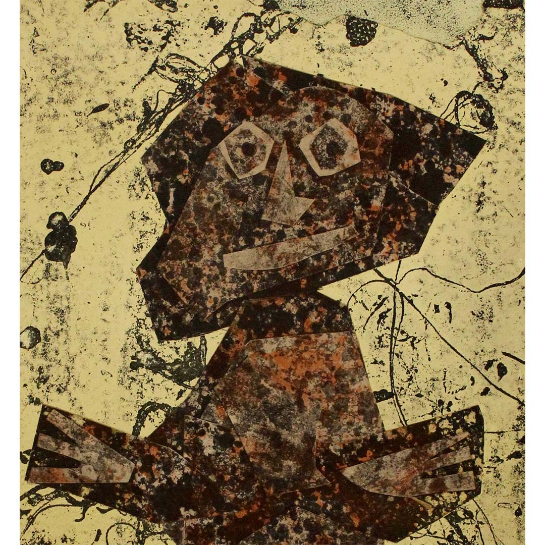 At the center of the poster is one of Dubuffet's unmistakable figures—raw, textured, and primitive—rendered in earthy tones with frenetic, scribbled outlines. The background is equally energetic, filled with abstract patterns that evoke both decay and vitality. The figure’s naïve form and expressive distortion echo Dubuffet’s lifelong pursuit of Art Brut, a concept he championed to describe art made outside the boundaries of traditional culture—instinctive, childlike, and unfiltered by academic conventions.