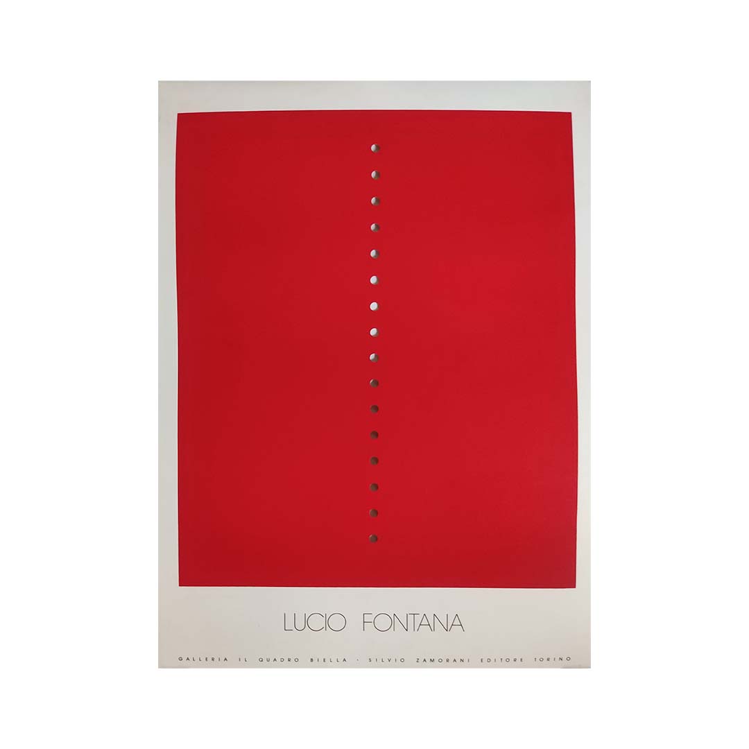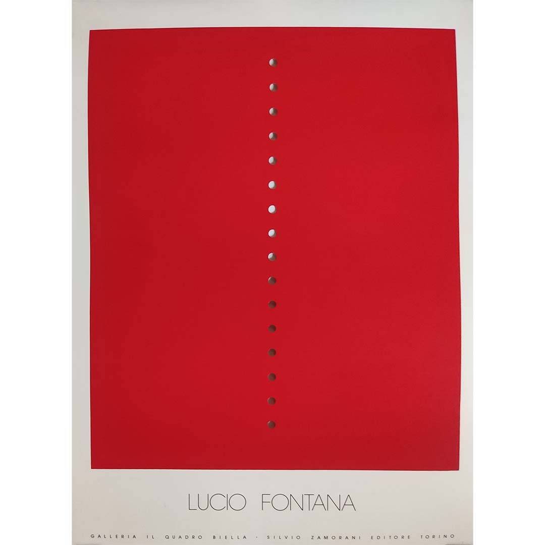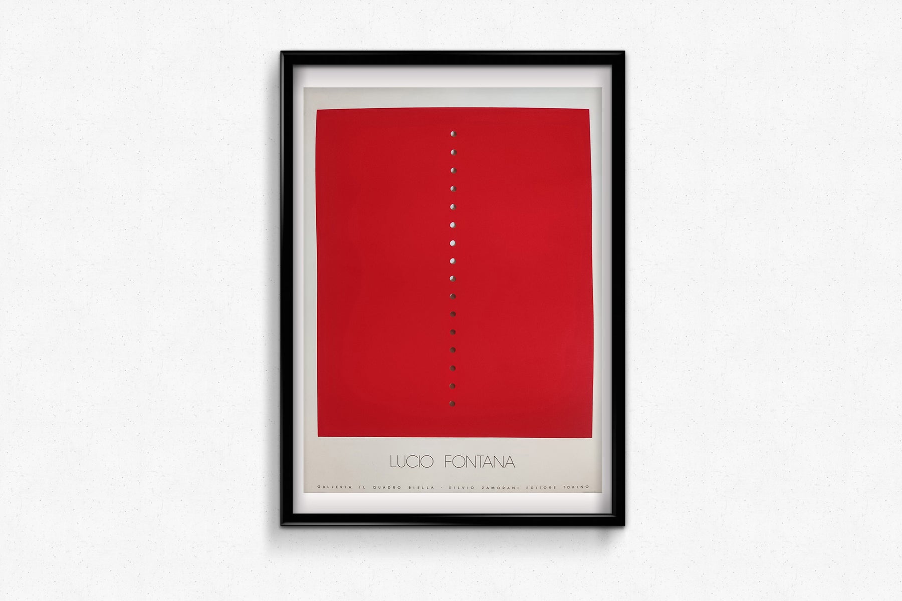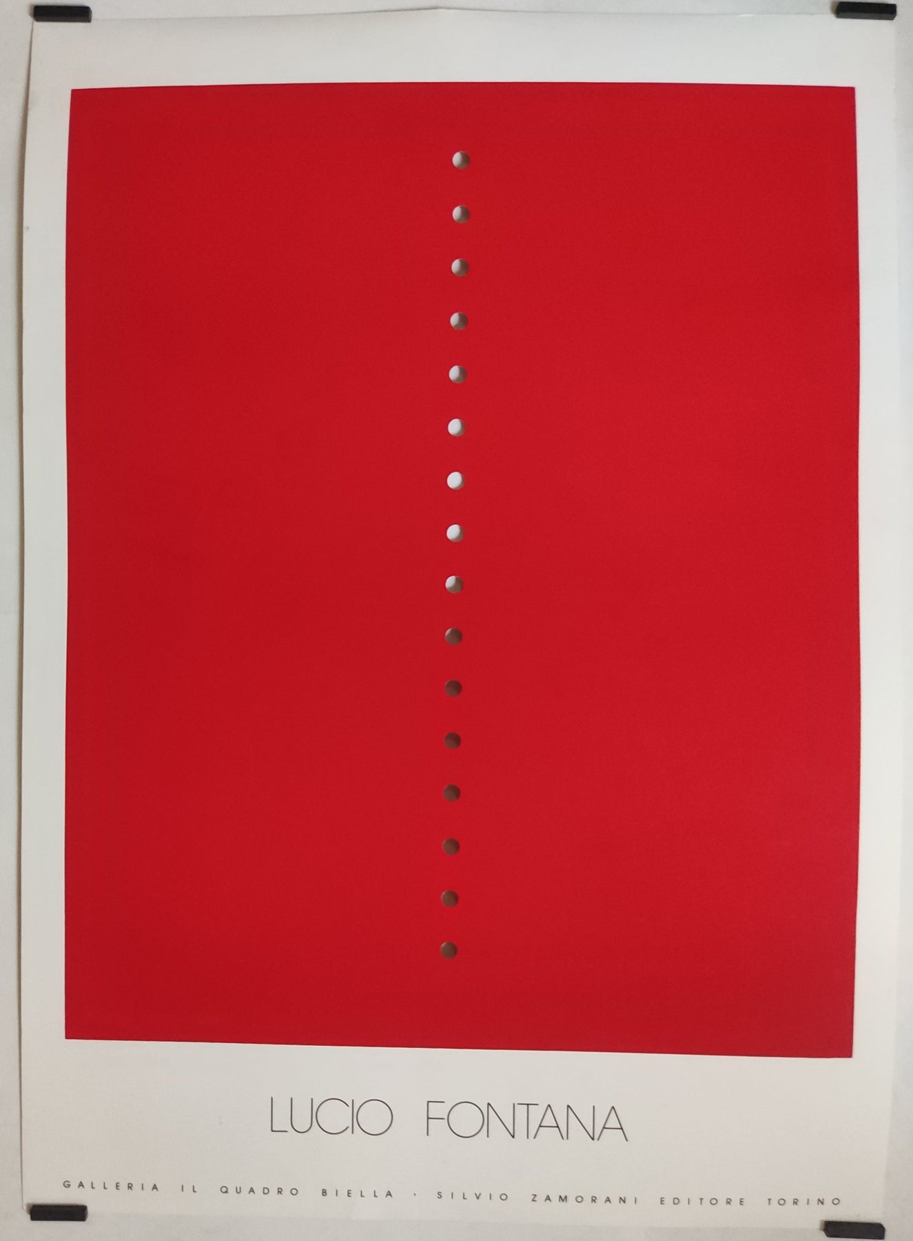 Minimal, radical, and unmistakably visceral, this circa 1970 original exhibition poster for Lucio Fontana captures the conceptual power of his groundbreaking Concetto Spaziale series. Designed for a show at Galleria Il Quadro in Biella and published by Silvio Zamorani Editore, the poster presents one of Fontana’s iconic red monochromes, pierced by a vertical line of precisely spaced punctured holes.
