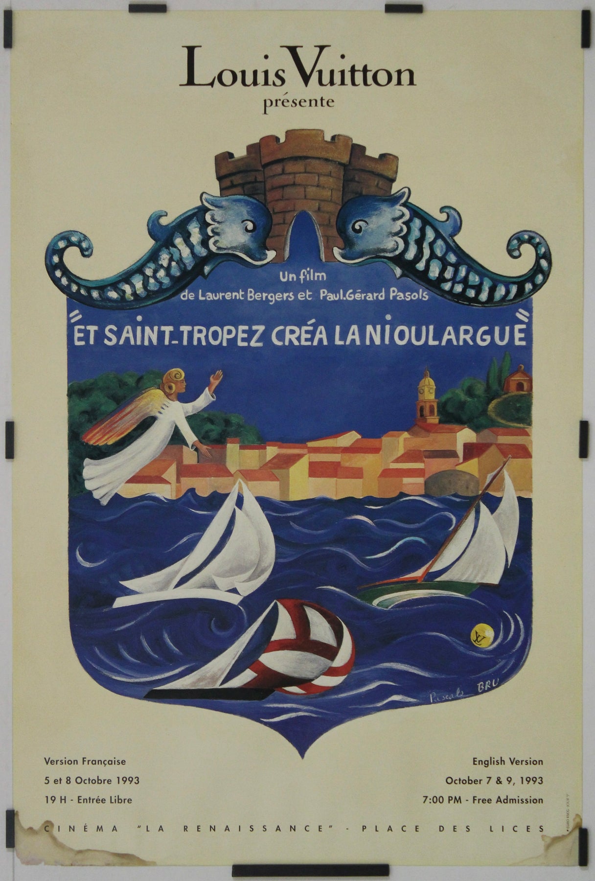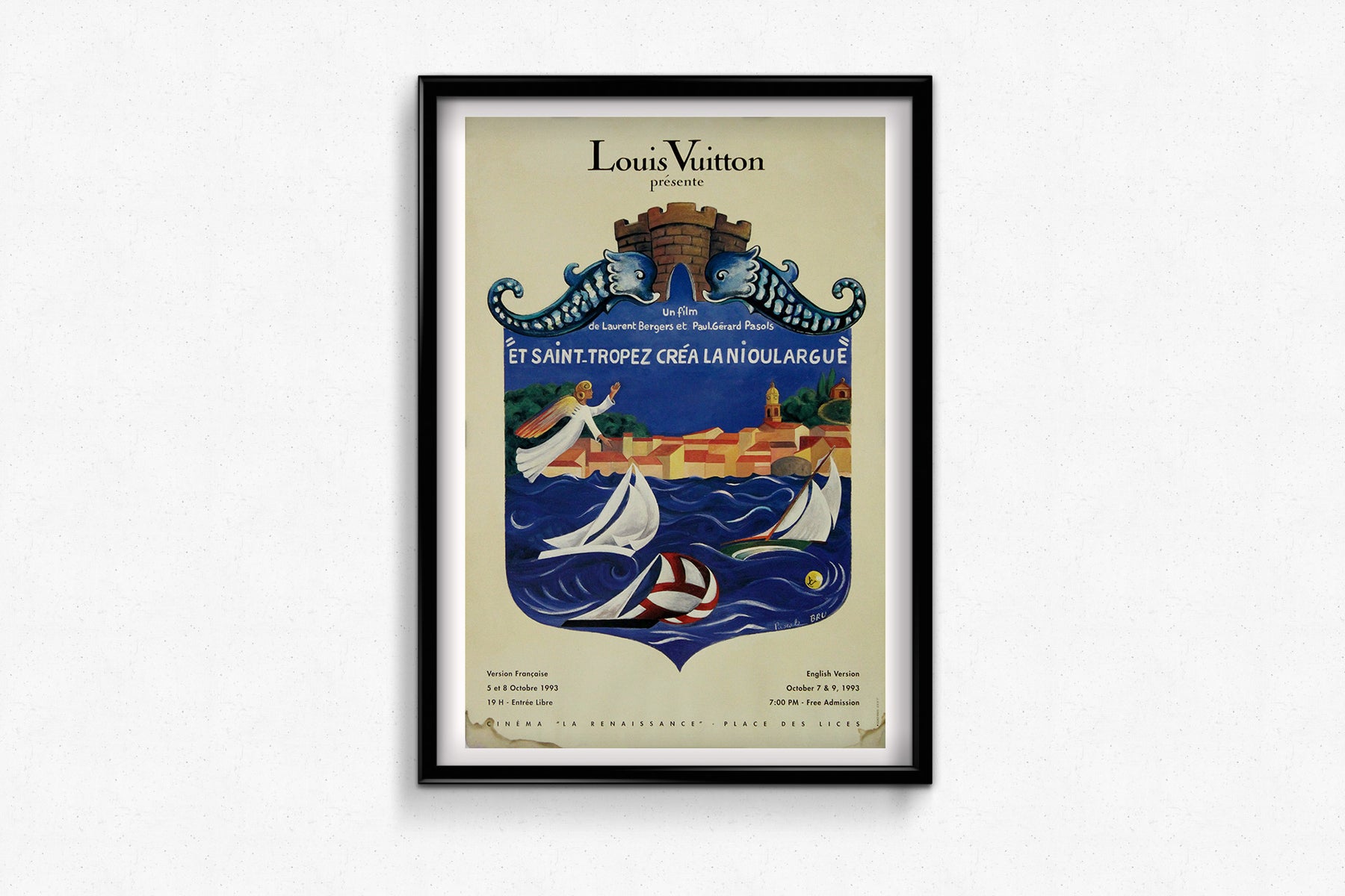 The text invites viewers to two bilingual screenings at Cinéma La Renaissance, Place des Lices—free of charge, in both French (October 5–8, 1993) and English (October 7–9, 1993). The design’s blend of charm, local color, and cultural pride reflects both the artisanal craftsmanship of the artist and the enduring lifestyle legacy that Louis Vuitton sought to highlight.