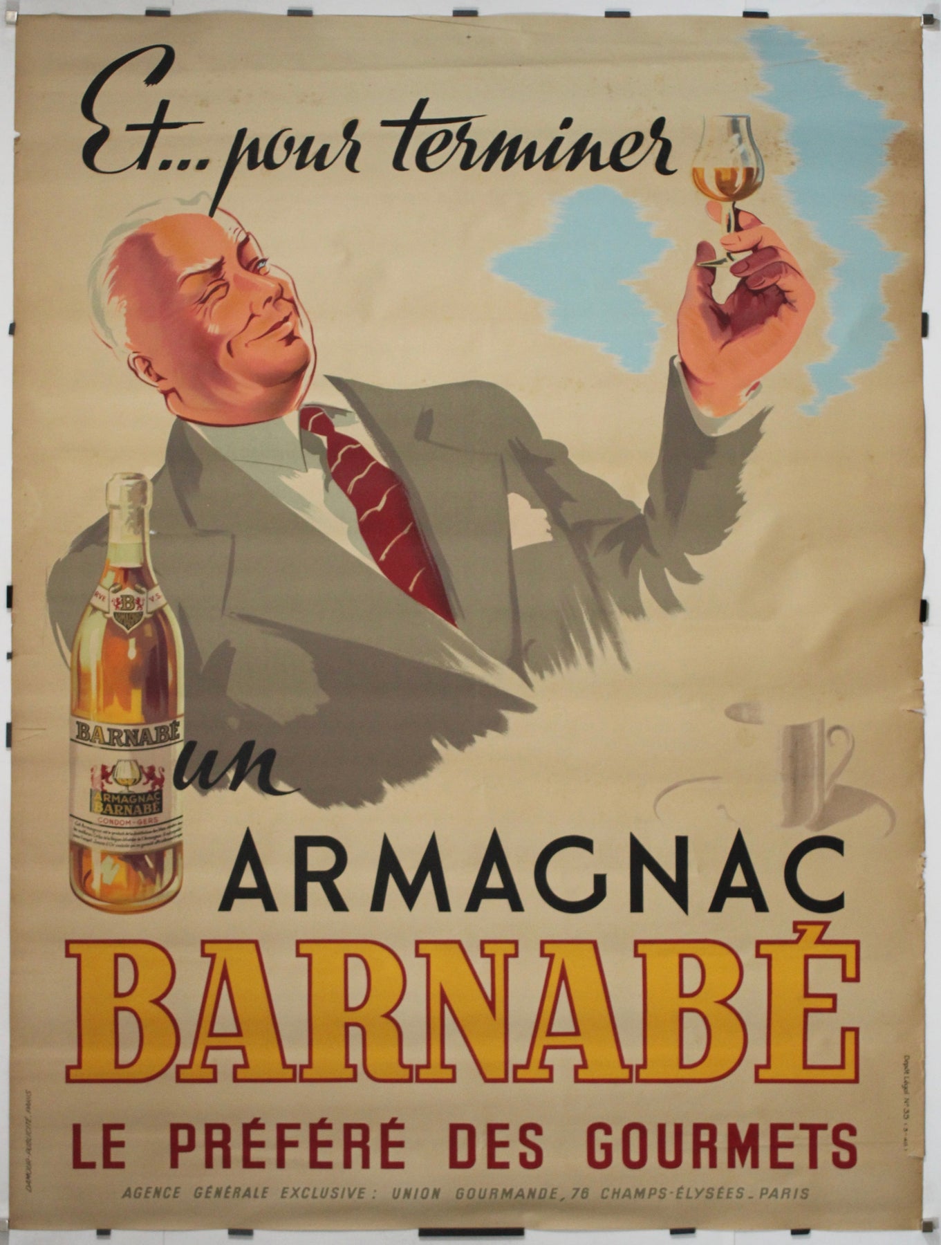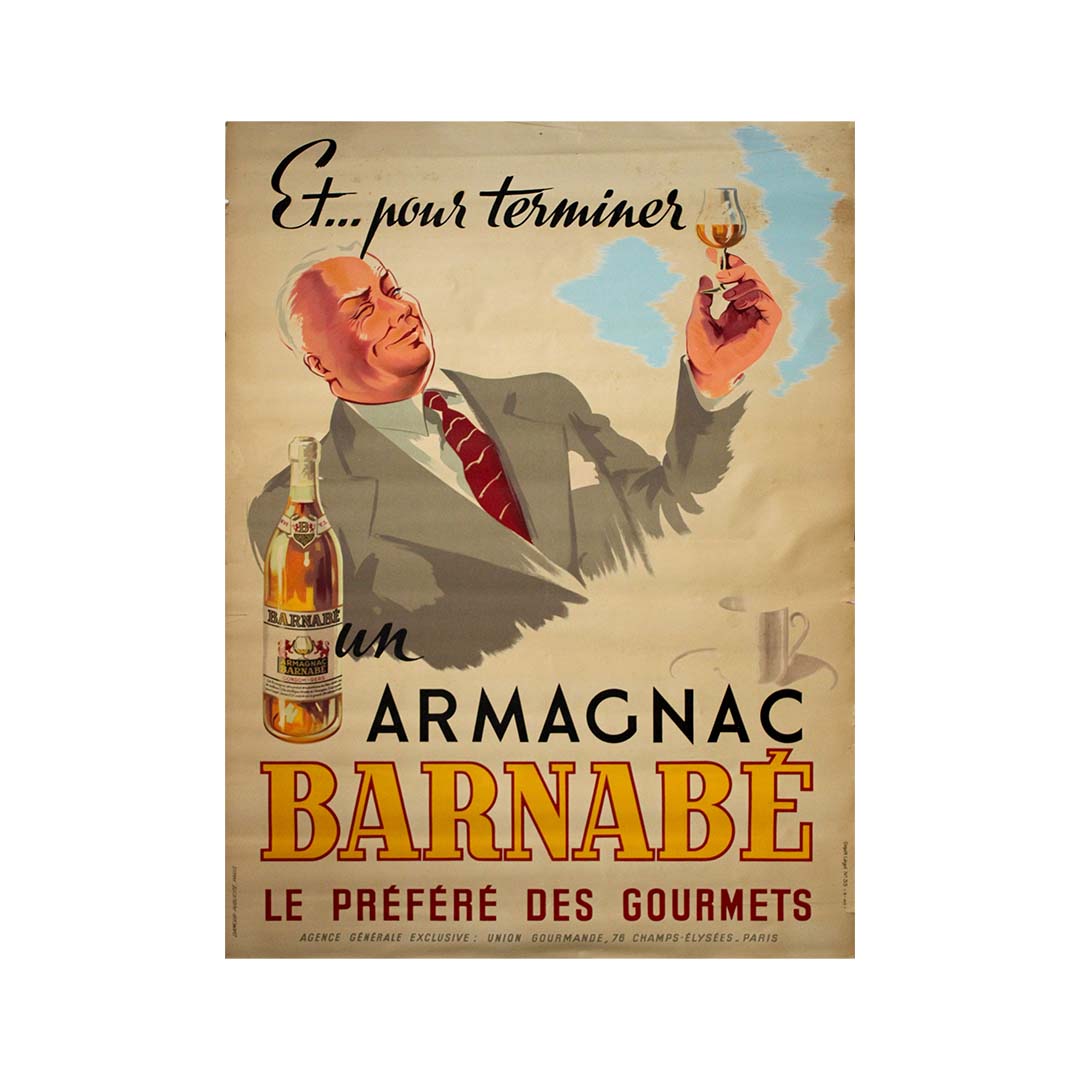 A post-war toast to refined indulgence, this original 1946 French advertising poster invites you to end any fine meal in true gourmet fashion—with a glass of Armagnac Barnabé.